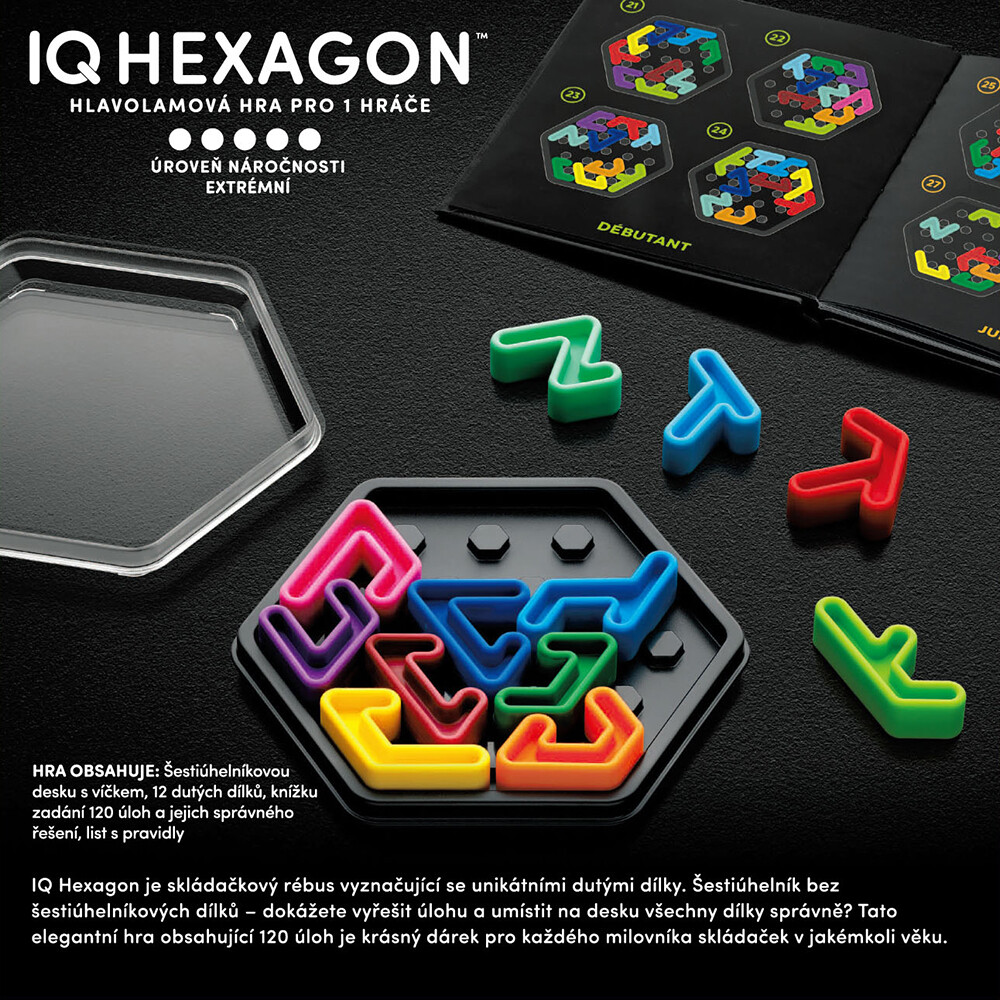 Připravte se na další chytrý hlavolam ze série IQ! Hra IQ Hexagon vás zavede do světa šestiúhelníkových dílků, které musíte umístit na hrací desku. V knížce zadání si vyberte jednu z úloh, kde je uvedena startovní pozice některých dílků – umístěte je na desku přesně podle zadání.