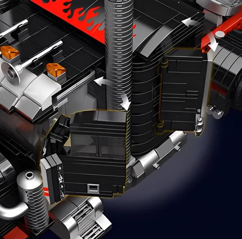 Součástí stavebnice jsou i stylové plameny na střeše, které dodávají trucku dravý vzhled, a ikonické vzduchové klaksony, známé svým dunivým zvukem. Vše doplňuje přehledný návod, se kterým stavbu zvládnete krok za krokem.