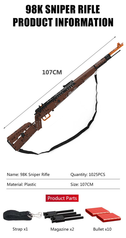 Německou útočnou pušku Mauser 98K je možné sestavit z 1025 dílků. Po sestavení měří puška 107 cm. Díky přehlednému návodu bude proces sestavení snadný a zábavný. Takový model může být krásnou dekorací vašeho domova nebo inspirujícím dárkem pro blízkého, který ocení vaši práci a dovednost.