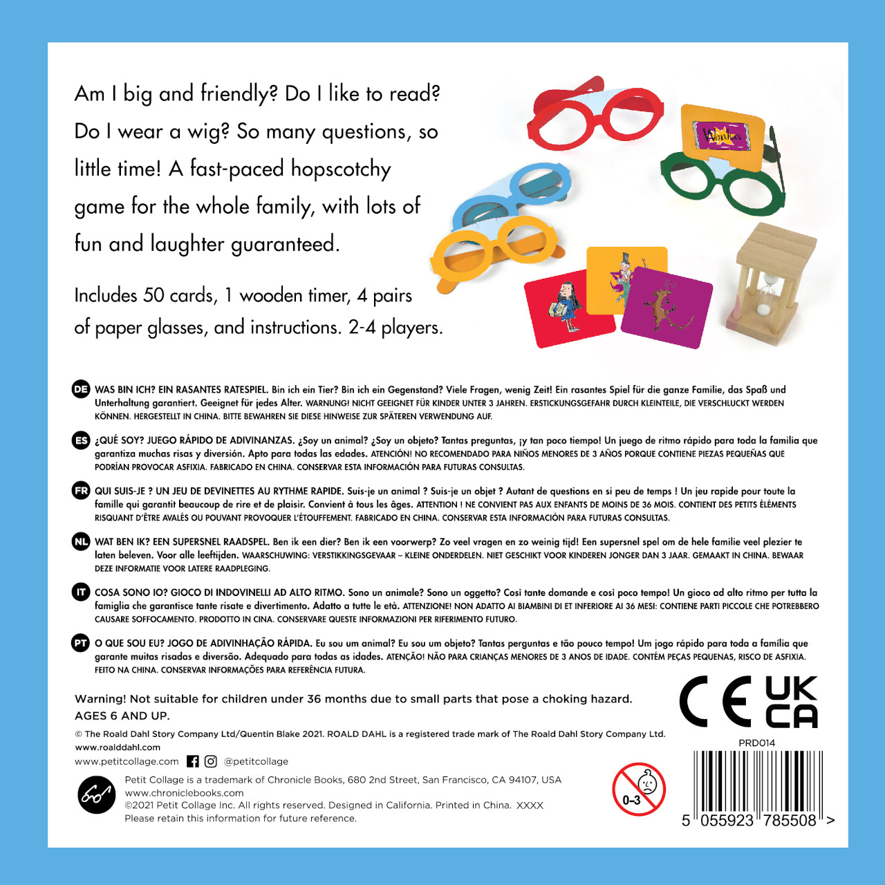 Vylosujte si kartičku, vložte ji do legračních brýlí, aby ji viděli jen ostatní, a otočte přesýpací hodiny. Sérií svých otázek a odpovědí spoluhráčů se pak ve vyměřeném čase pokuste rozklíčovat, jakou postavu, nebo předmět ze světoznámých příběhů Roalda Dahla jste si vylosovali. Času máte málo, otázky musíte rychle, ale pečlivě vážit! Karty zdobí původní, originální ilustrace z knih. Obsažené brýle jsou ve dvou velikostech, pro děti i dospělé, hra je tak zvláště vhodná pro chvíle trávené v rodinném kruhu. Součásti jsou vyrobeny z udržitelně získaného papíru, potištěny rostlinnými inkousty a baleny v praktické, barevně ilustrované krabičce.