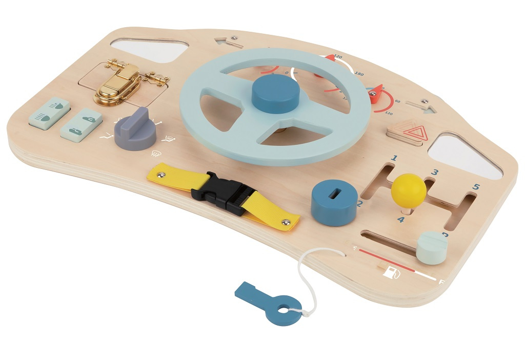 Mami, tati, dneska řídím já! Tato hrací deska přináší spoustu zábavy, díky které bude moci Vaše dítě rozvíjet svou zručnost, zvídavost a zejména jemnou motoriku. Zámky, pásky a tlačítka dávají dítěti možnost procvičovat různé posouvání, otáčení či otevírání a připravit se tak na každodenní úkony. Mimo aktivit zapojující smyslové dovednosti deska disponuje volantem - skvělá možnost jak posunout představivou hru ještě dál. Jízda to bude daleká!