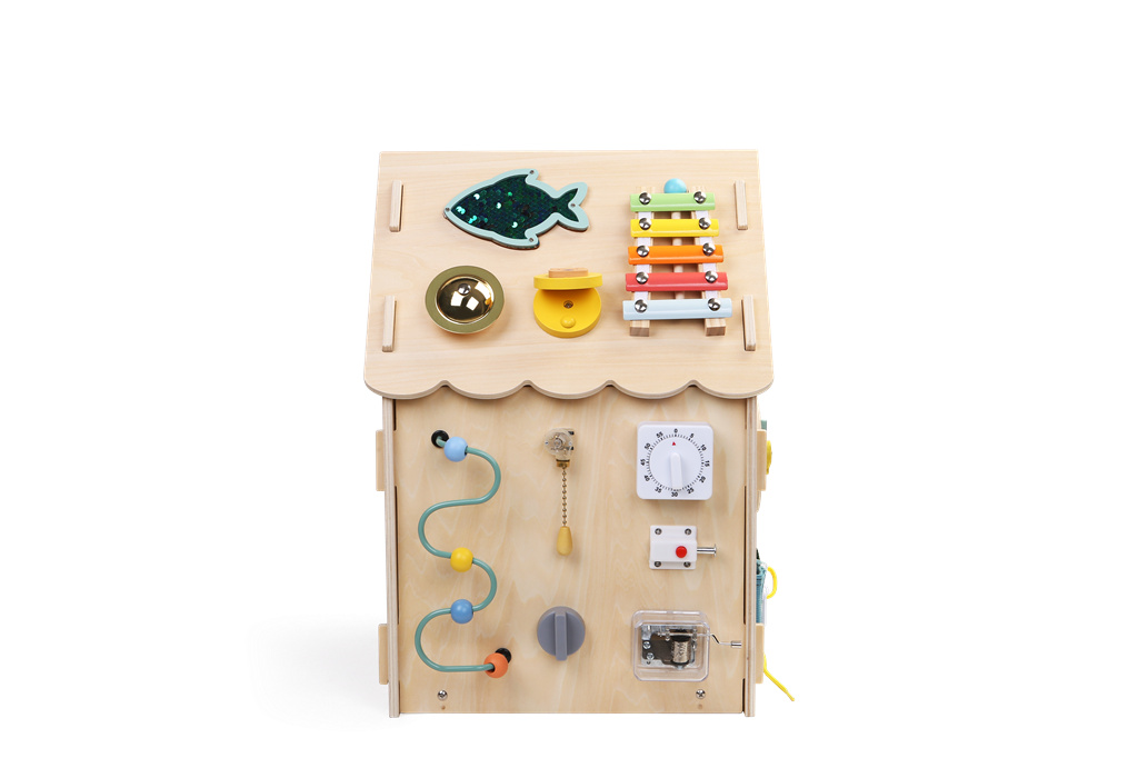 Objevte svět zábavy a učení s dřevěným domečkem se spoustou aktivit! Každá strana nabízí množství interaktivních prvků, které děti zabaví a zároveň podpoří rozvoj jemné motoriky, logického myšlení i smyslového vnímání. Děti mohou otáčet barevným volantem, zkoušet řadicí páku, vést kuličku labyrintem, točit ozubenými kolečky a sledovat, jak do sebe zapadají. Domeček nabízí také počítadlo, otáčecí větrník a závěsná korálková oblaka, které rozvíjejí smyslové vnímání i jemnou motoriku. Nechybí ani trénink praktických dovedností! Děti si mohou zkoušet otevírání a zavírání různých typů zámků, závor a západek, učí se zavázat tkaničky, zapnout zip či knoflík. Procvičují si trpělivost, přesnost i logické myšlení a připravují se tak zábavným způsobem na úkony každodenního života. Domeček je vyroben z kvalitního přírodního dřeva a natřen netoxickými barvami. Všechny hrany jsou hladké a bezpečné pro dětské ruce. Skvělý dárek pro zvídavé děti od 3 let. Hračka podporuje samostatnost, kreativitu a přirozenou touhu objevovat svět kolem sebe.