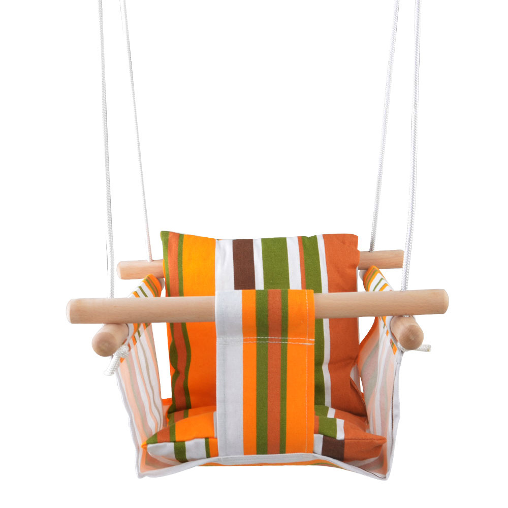 Dětská textilní houpačka z 100% bavlny a pevného dřeva, s 2 karabinami pro zavěšení a výškově nastavitelnými lany.