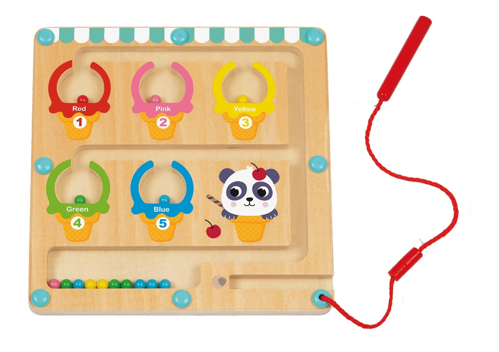 Pomozte roztomilé pandě doplnit kuličkovou zmrzlinu do správných kornoutů! Cílem hry je dopravit barevné kuličky umístěné v zásobníku vlevo dole pomocí magnetického pera do zmrzlinových kornoutů odpovídající barvy. Každý kornout je označen číslem, které představuje počet kuliček dané barvy v kornoutu. Děti musejí zvolit správnou cestu, aby se dostaly k cíli. Při hře děti procvičují jemnou motoriku a koordinaci ruka-oko, logické myšlení, učí se soustředění a trpělivosti. Hra naučí děti rozpoznávat barvy a čísla od 1 do 5.