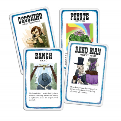 Hra obsahuje: 15 karet Fistfulu + 5 bonusových karet (3 postavy a 2 karty High Noon).