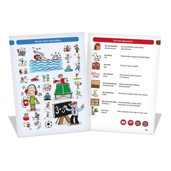 Kniha Německý obrázkový slovník z edice Kouzelné čtení je vhodná pro začátečníky i mírně pokročilé. Interaktivní mluvící kniha obsahuje základní slovíčka s obrázky a jednoduché věty.
