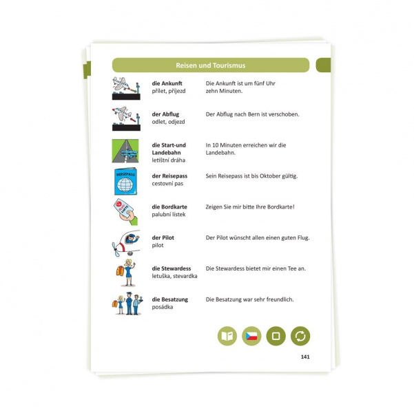 Německý obrázkový slovník je rozdělen do 11 tématických kapitol, které obsahují přes 1000 německých slovíček včetně obrázků a příkladů použití. Ve slovníku nechybí kompletní český překlad.