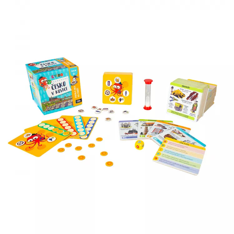 V krabici Kvído v kostce najdete: 60 karet s obrázky i otázkami k danému tématu, 20 oboustranných bonusových karet pro Kvídovu paměťovku, 4 bodovací karty, 32 obrázkových žetonů pro bonusový úkol, 40 bodovacích žetonů, 1 přesýpací hodiny na 15 sekund a 1 Kvídovu hrací kostku.