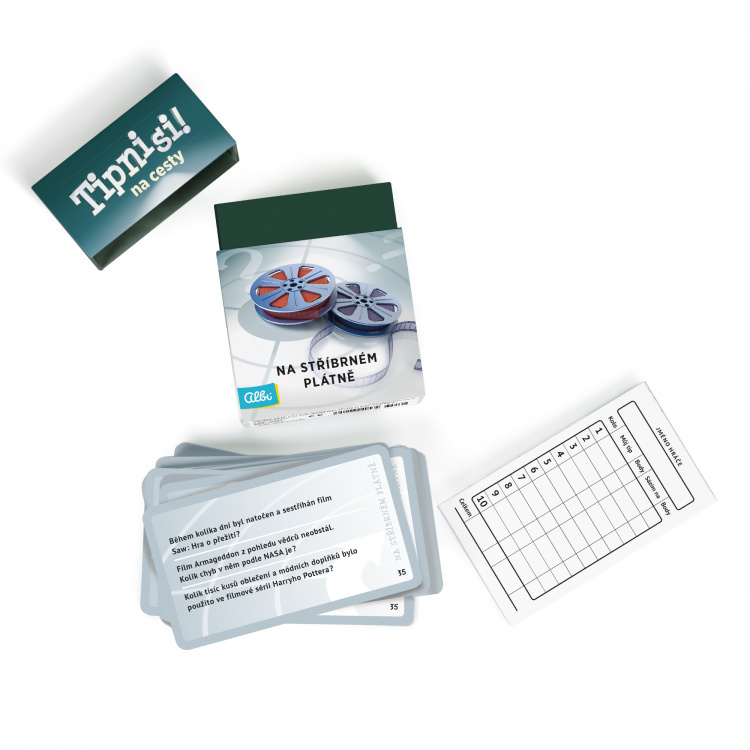 Hra Tipni si! Na stříbrném plátně obsahuje: 63 karet se 198 otázkami, bodovací bloček a pravidla.