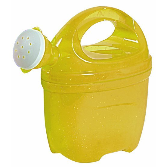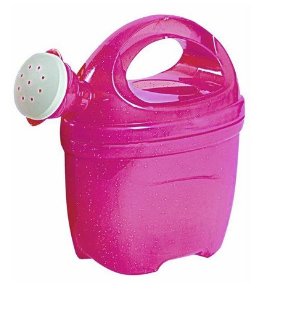 Průhledná konvička na vodu se třpytkami a s kropítkem ve tvaru kytičky.