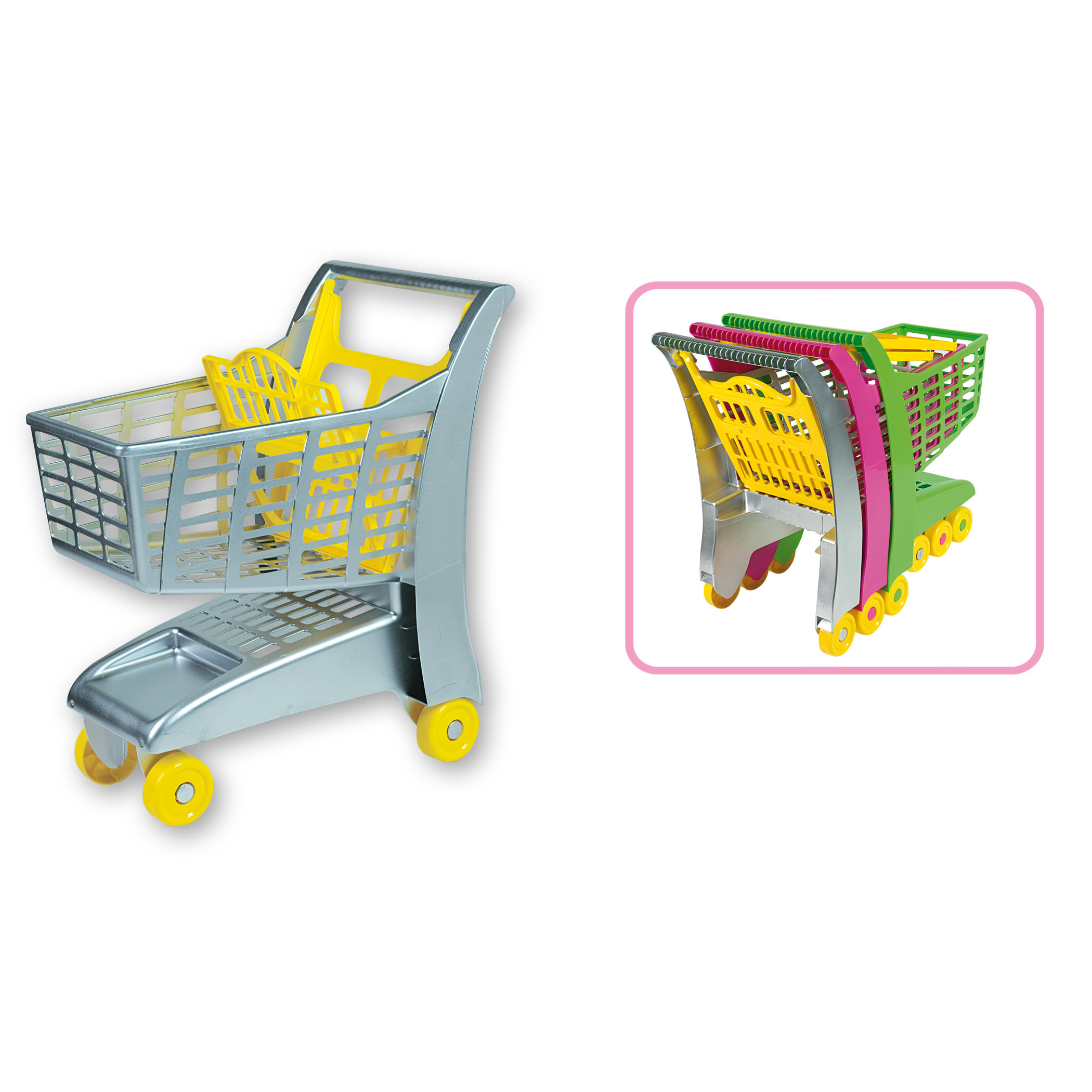 Velmi oblíbený nákupní vozík designově připomínající vozíky z dnešních supermarketů. Vozík je opatřen sedátkem, do kterého lze pohodlně usadit panenku. Vyrobený z kvalitních plastů v Itálii. Velikost: 41 x 27 x 47 cm, váha: 1,23 kg.