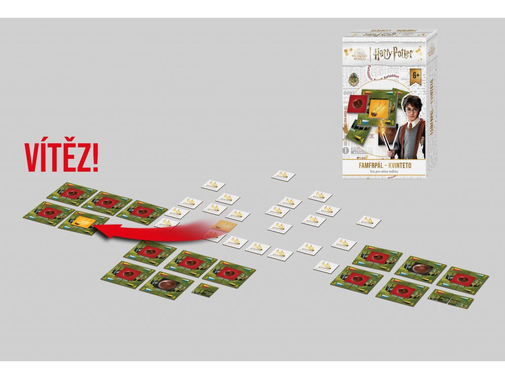 Cílem hry je získat co největší počet kvintet s nejvyšší bodovou hodnotou. Jedno kvinteto se skládá ze 4 kartiček, které tvoří hřiště, a páté kartičky Camrálu nebo Potlouku nebo Zlatonky. Originální stolní rodinná hra pro malé i velké hráče, se kterou se stanete součástí známého příběhu Harry Pottera.Hra je jednoduchá na pochopení pravidel. Hru mohou hrát děti od pěti let až šesti let. Hru si s chutí zahrají starší děti, nebo celé rodiny. Hra je velmi živá, zábavná, komunikativní. Hráči procvičují paměť, mohou uplatnit taktické uvažování. Vyrobeno v ČR.