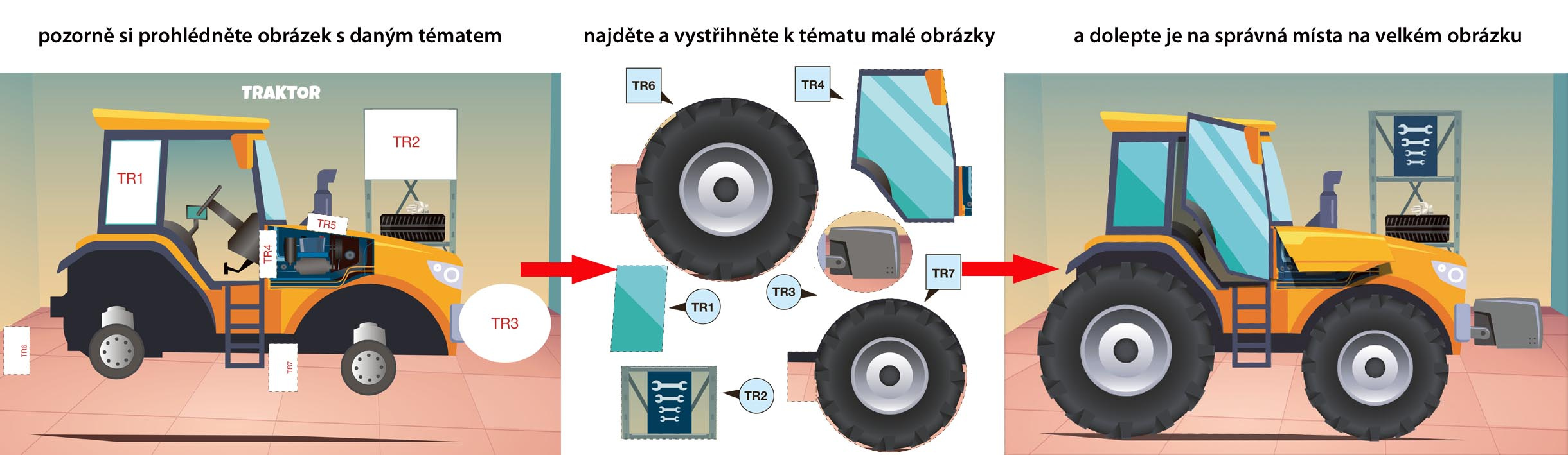 Na velkém obrázku jsou bílá místa (označená číslem a písmenem). Na tato bílá místa se nalepí příslušné vystřižené dílky se stejným číslem a písmenem. K orientaci pomáhají barevné předlohy na vnitřní straně obálky. Nalepením všech správných dílků vzniknou hotové obrázky.