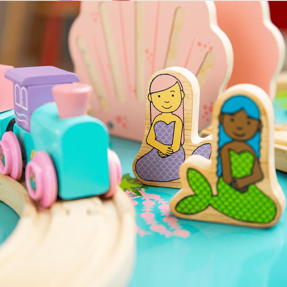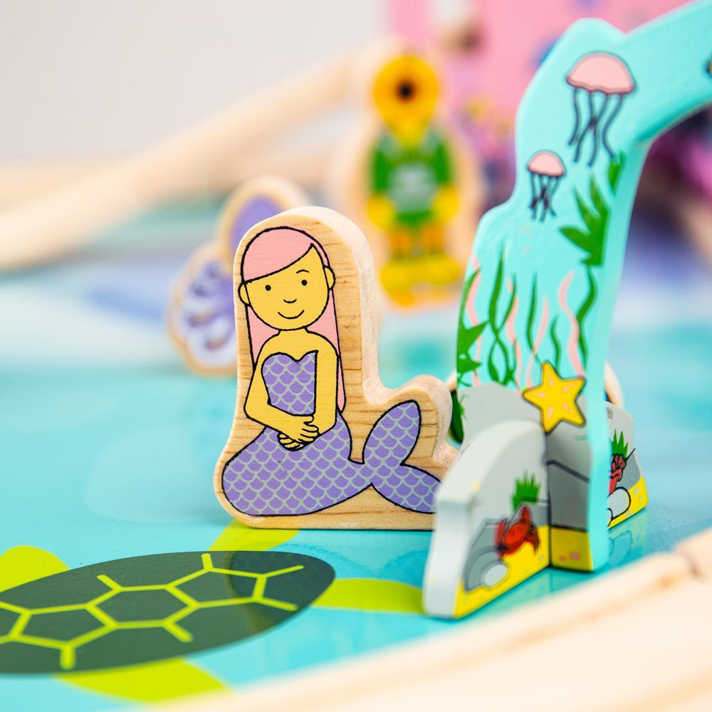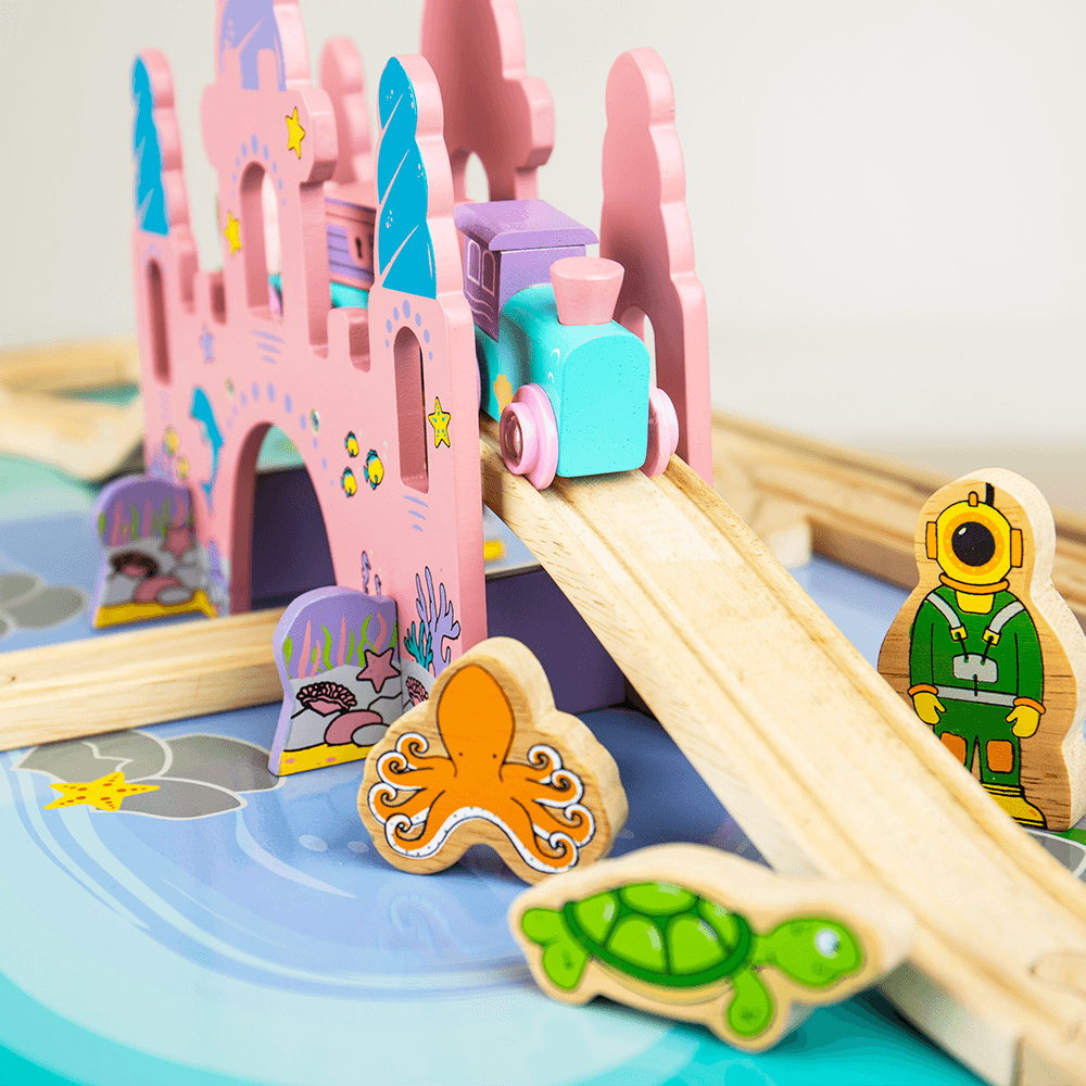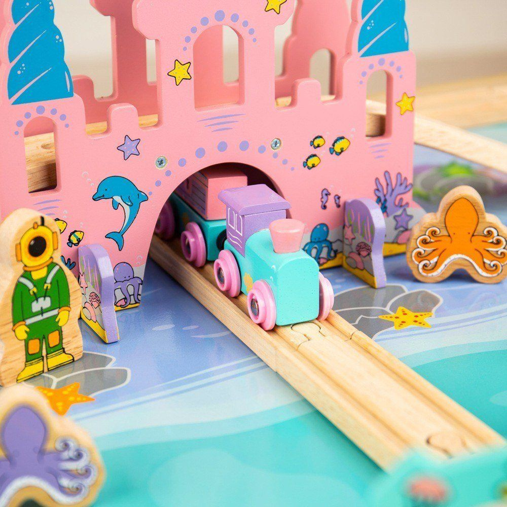 Ponořte se do představivé hry vodního světa s touto stolní vláčkodráhou. Pevný dřevěný stůl s velmi kvalitními dílky vláčkodráhy a barevnou lokomotivou s 2 vagónky. Mořský svět by se neobešel bez truhlice s pokladem, figurek mořských pan, mušlí a dalších mořských živočichů. Stůl je dost velký, takže si u něj může hrát více dětí najednou, to znamená více zábavy! Podpoří děti v komunikaci a sociálních dovednostech.