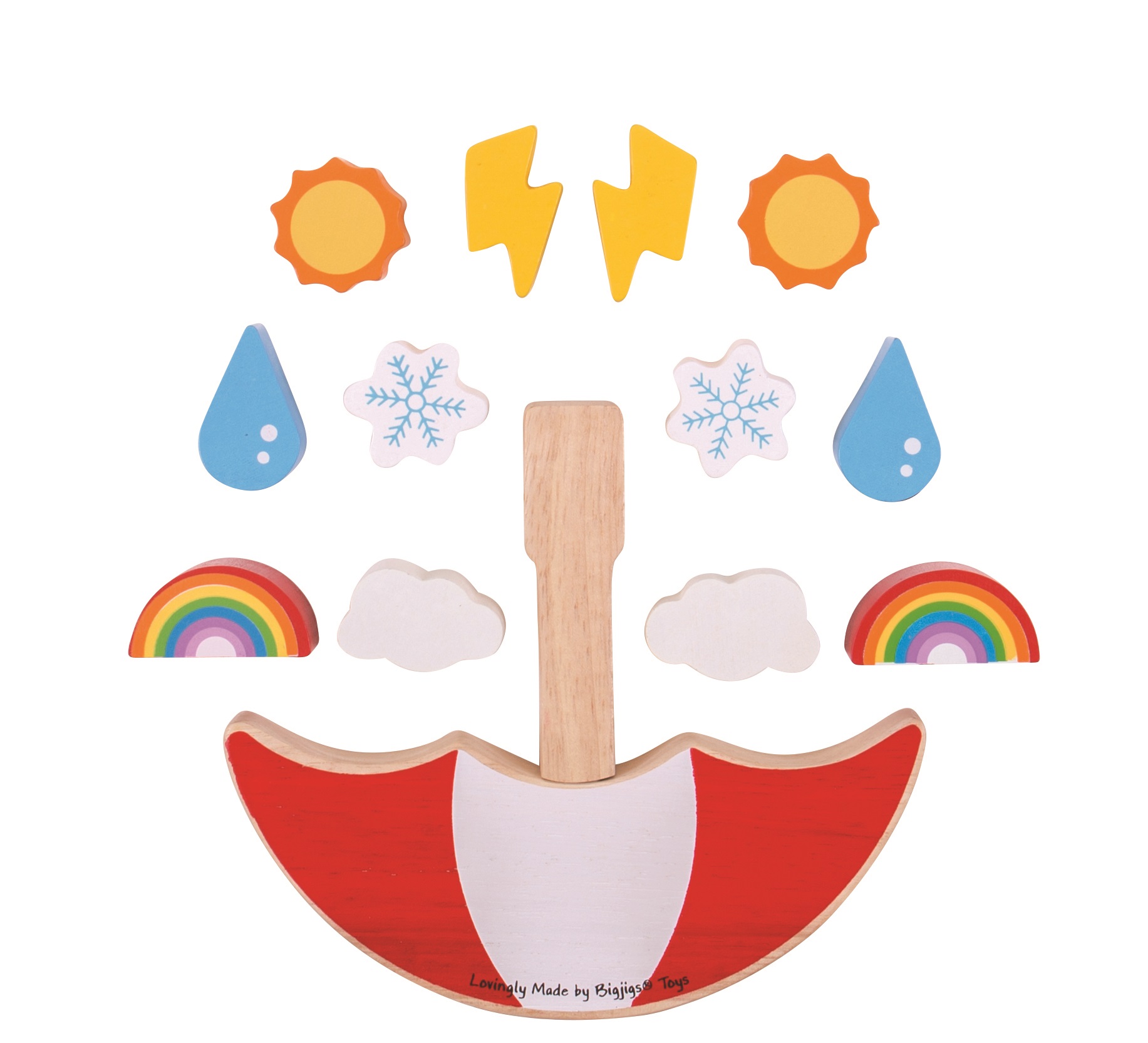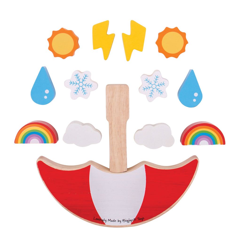Jak vysoko můžete vyvážit různé dílky počasí? Jedná se o hru dovednosti a trpělivosti, která bude bavit celou rodinu! Hráči si musí střídavě brát po jednom kuse a skládat na deštník, aniž by ho převrhli. Poslední hráč, který úspěšně přidá kus vyhraje! Zahrnuje 6 symbolů počasí včetně duhy, oblačnosti, sněhové vločky, dešťové kapky, slunce a blesku. Rozvíjí koordinaci rukou a očí, jemné motorické dovednosti a zručnosti. Podporuje logické myšlení. Vyrobeno z vysoce kvalitních, zodpovědně dodávaných materiálů. Odpovídá současným evropským bezpečnostním normám. Skládá se z 13 dílků.