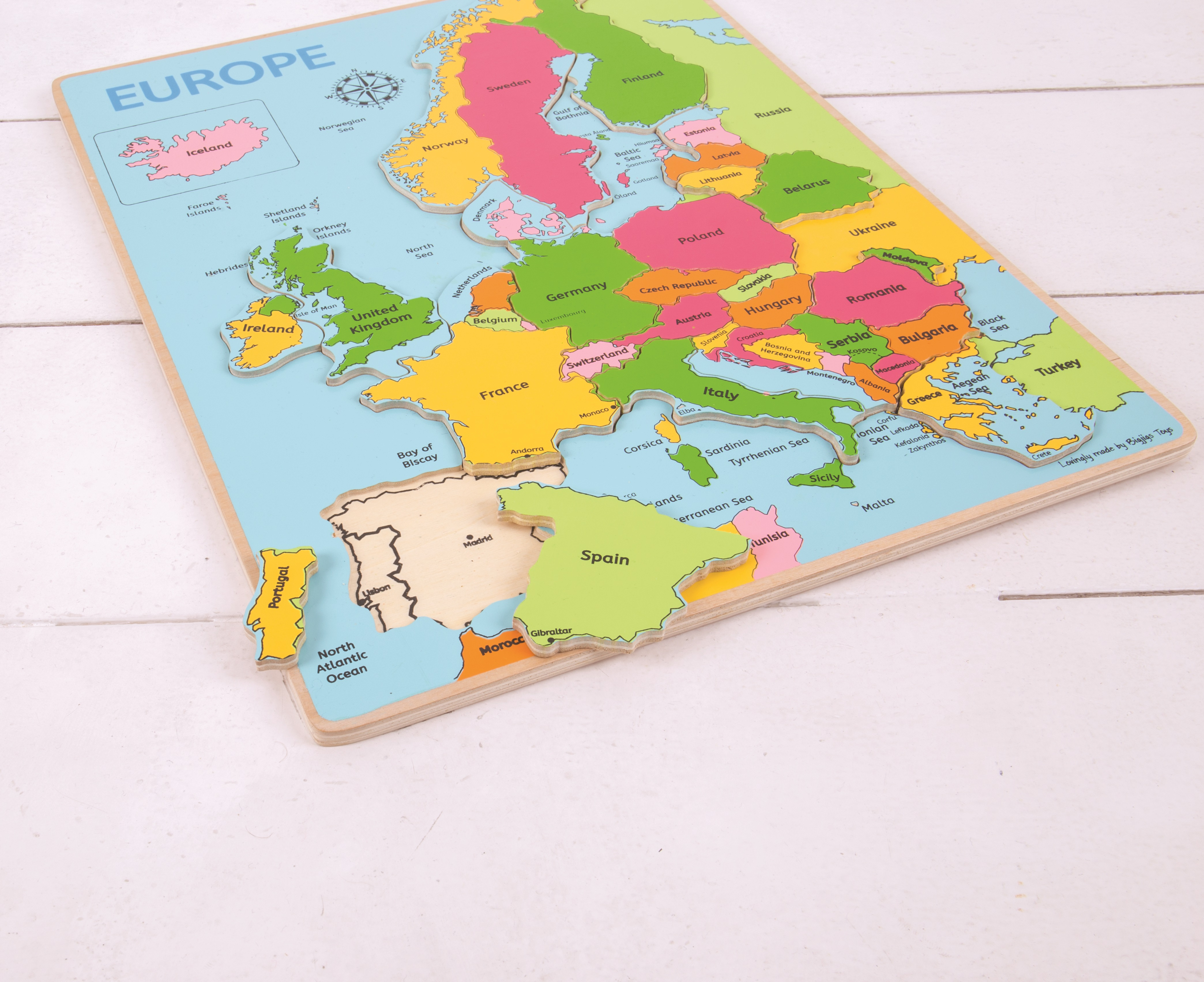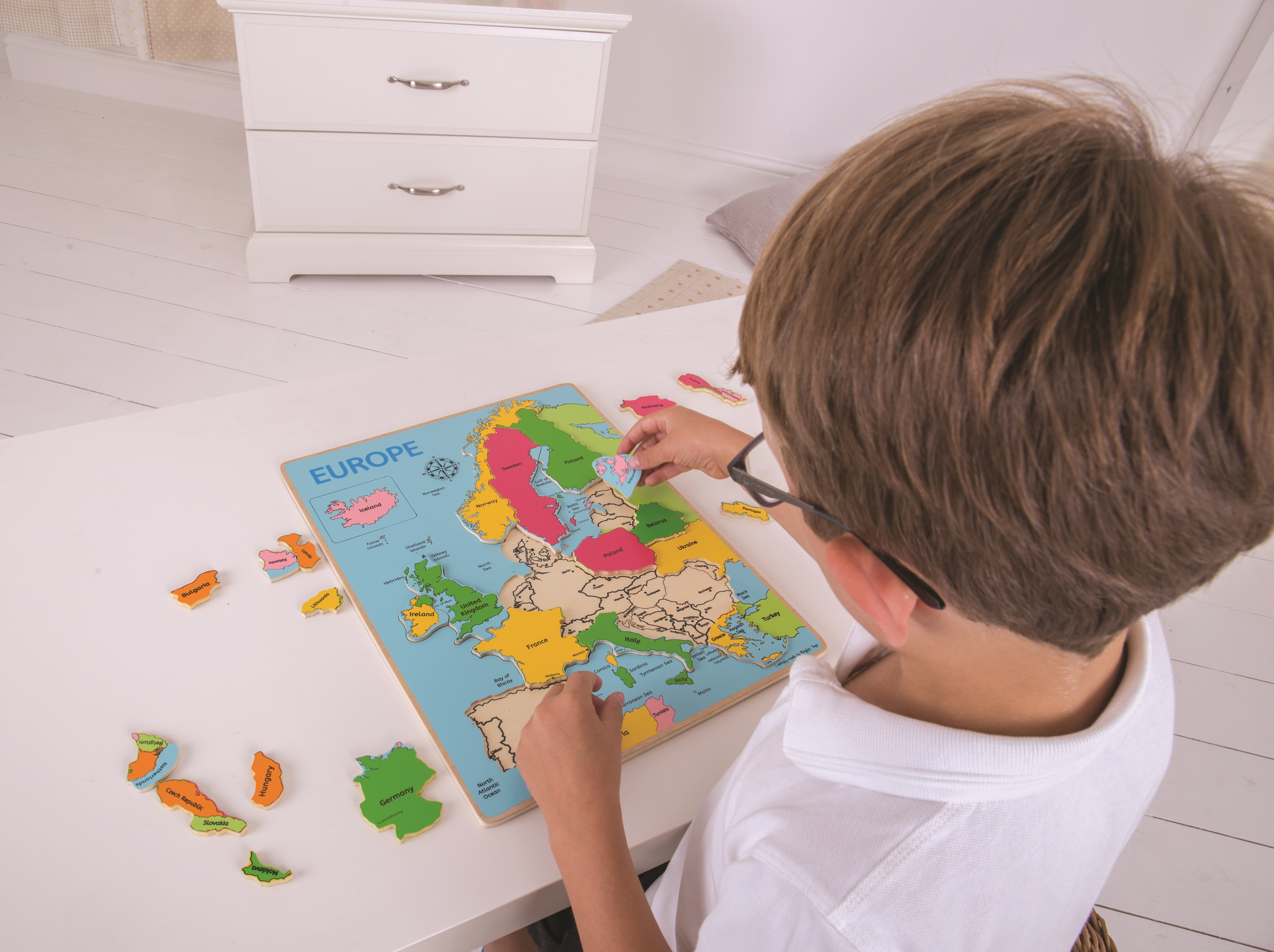 Tato fantastická mapa Evropy zajisté okouzlí zvědavé děti, které se naučí, jak je Evropa spojená. Děti se učí složení Evropy pomocí umísťování jednotlivých dílků na základní desku. Každý díl vkládačky je na ní vyznačen.