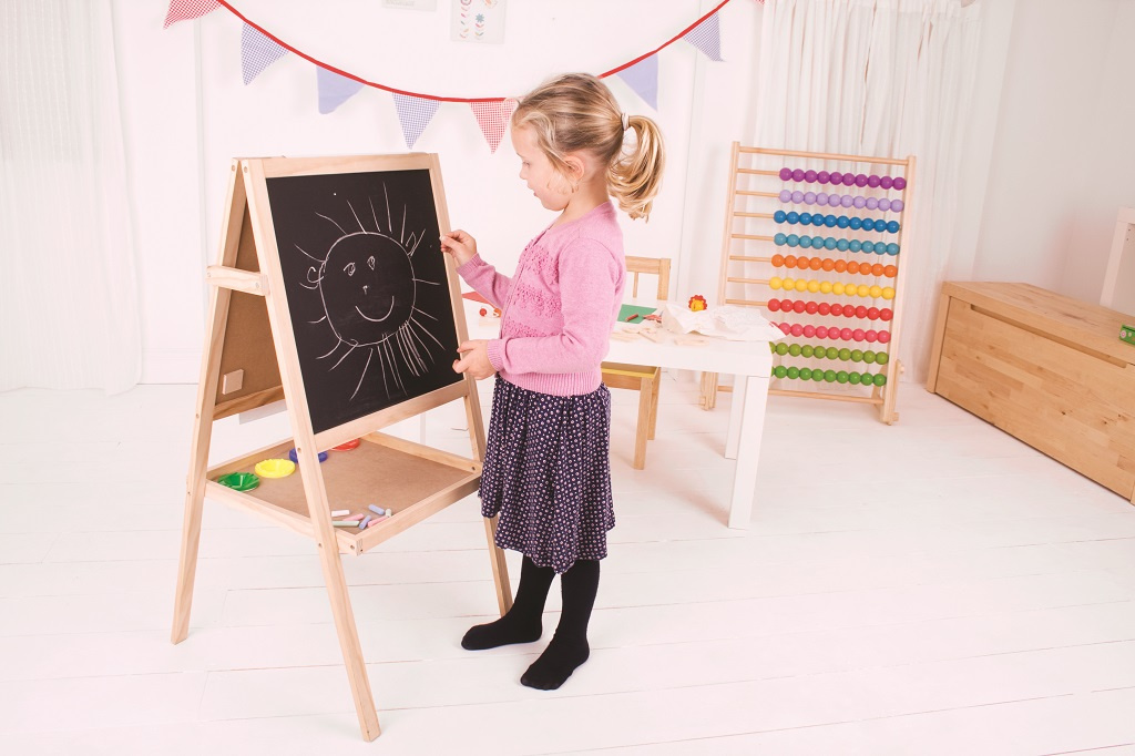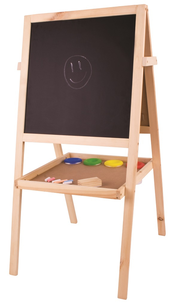 S touto všestrannou tabulí lze snadno rozvíjet kreativní umělecké dovednosti dětí. Z jedné strany magnetická tabule se suchým stíráním fixů, z druhé strany tradiční tabule pro křídu. Součástí je role papíru, kterou lze snadno upevnit na tyč skrytou mezi tabulemi v jejich horní části, dále čtyři nádobky na barvy, guma a 12 barevných kříd.