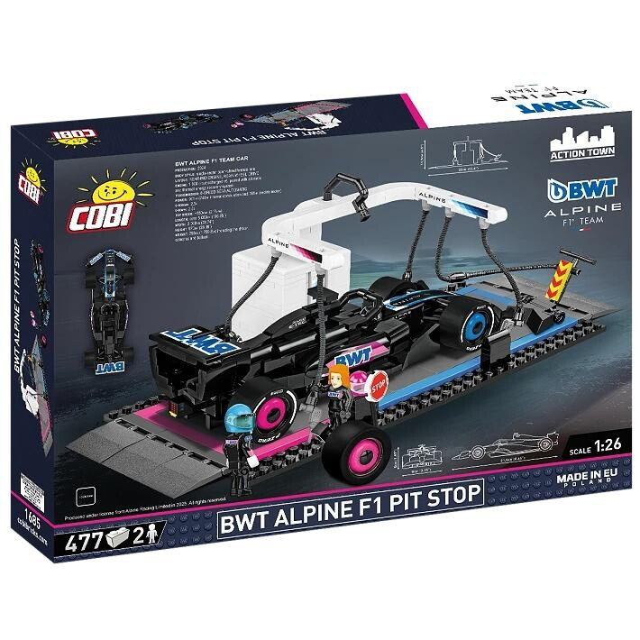 S novou stavebnicí COBI BWT Alpine F1 Pit Stop se ponoříte do světa Formule 1, kde každá vteřina rozhoduje. Model je zpracován v měřítku 1:26 a obsahuje celkem 477 kvalitních dílků. Sada zahrnuje detailně propracovaný závodní monopost v ikonickém růžovo-modrém zbarvení týmu BWT Alpine, prostor pit stopu s technickým vybavením a dvě figurky – jezdce a mechanika. Nechybí gumová kola pro hladký pohyb, pohyblivé končetiny figurek ani autentické potisky přímo na kostičkách. Díky přehlednému návodu si stavebnici užijí děti i dospělí, a výsledný model se skvěle hodí jak na hraní, tak na výstavku. Rozměry modelu po sestavení jsou 32 cm na šířku, 16 cm na délku a 11,5 cm na výšku.