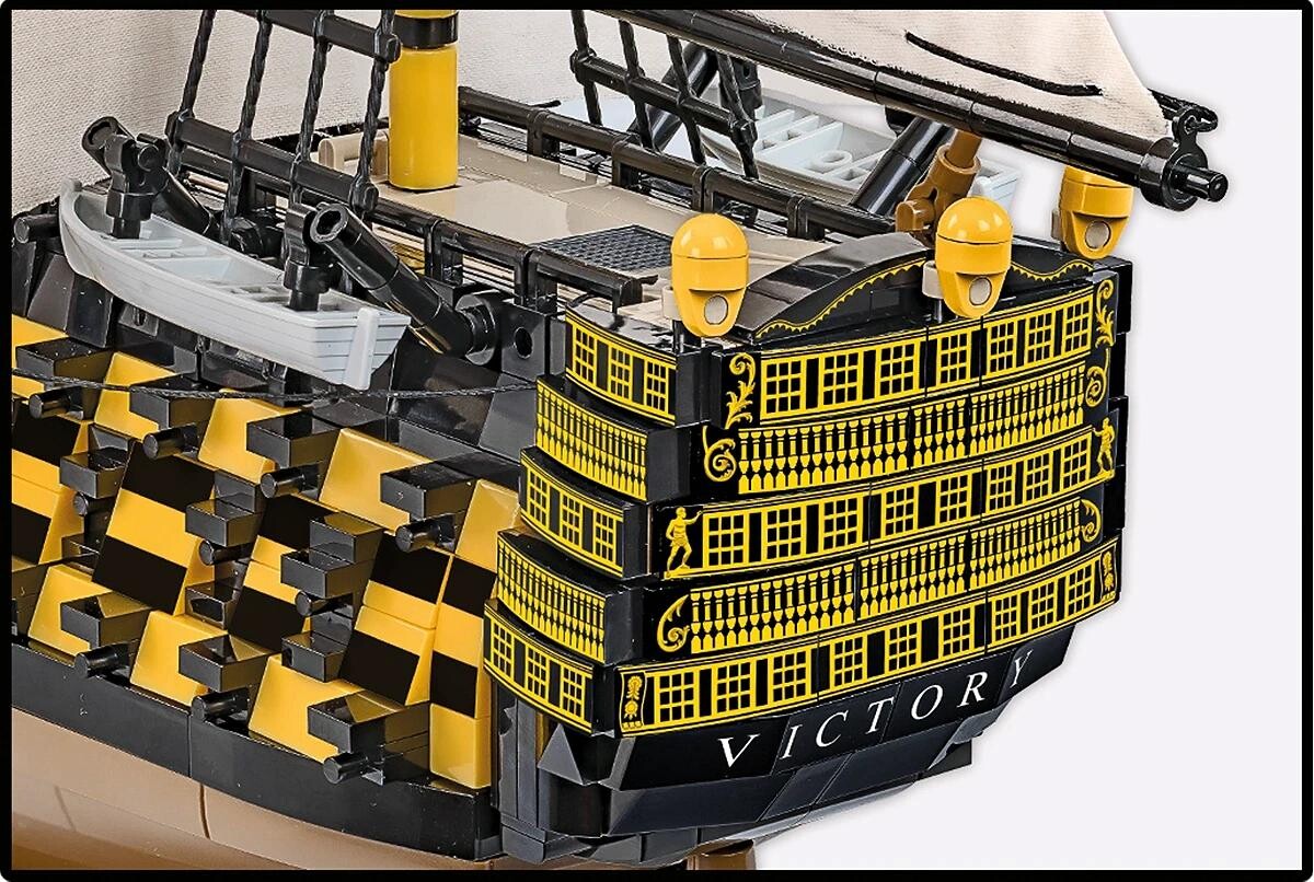 Sestavte si detailní model legendární britské dělové lodi první třídy HMS Victory, která se dodnes nachází ve službách britského námořnictva. Tato nádherná stavebnice z limitované edice obsahuje 2607 kostek a po sestavení měří 60,5 cm na délku a 43,5 cm na výšku. Model je bohatě vybaven látkovými plachtami, realistickým provazovým ráhnovím a 96 děly rozmístěnými na třech palubách. Součástí je také pevný stojan s popisem a dvě figurky – viceadmirála Horatia Nelsona a Trafalgarský sloup s jeho sochou. Každé balení je doplněno certifikátem pravosti s unikátním sériovým číslem.