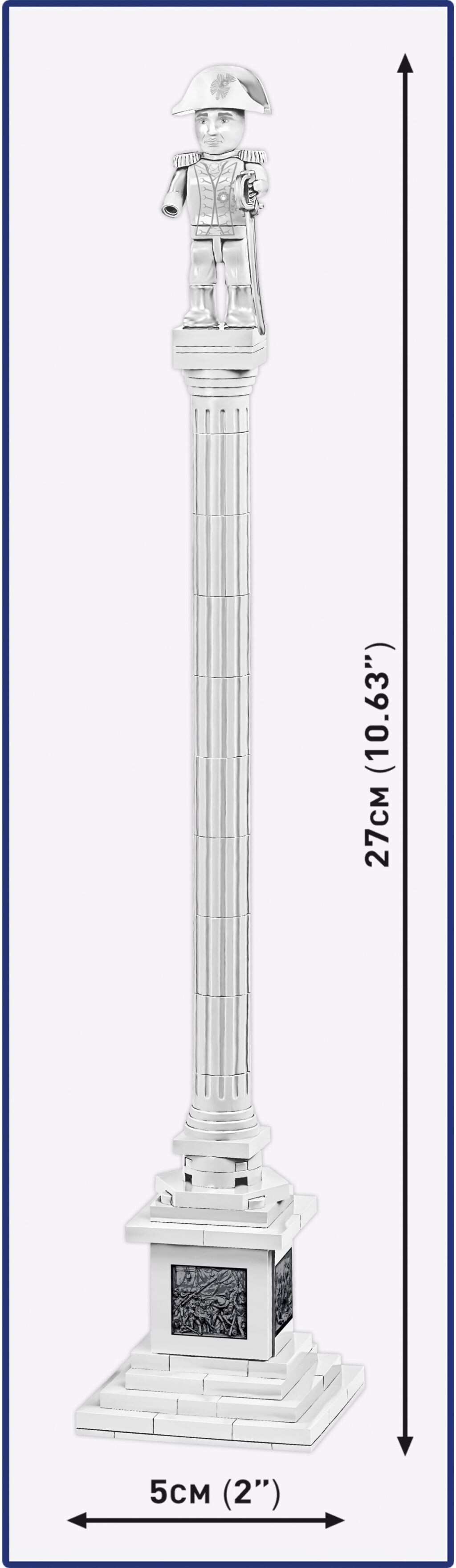 Sloup připomíná slavnou bitvu u Trafalgaru z roku 1805, v níž viceadmirál Nelson porazil francouzsko-španělskou flotilu a zajistil Británii námořní nadvládu na více než století. Pomník byl navržen Williamem Railtonem, zdobí jej čtyři reliéfy z bronzu přetaveného z ukořistěných děl a sochu lva na podstavci doplnil slavný Sir Edwin Landseer. COBI věrně zachytilo charakteristické rysy této památky – od kamenného sloupu až po postavu admirála a výzdobu podstavce. Tento set je nejen výbornou hračkou, ale i interaktivní lekcí historie – ideální pro všechny, kteří milují vojenské dějiny a kvalitní stavebnice s příběhem.