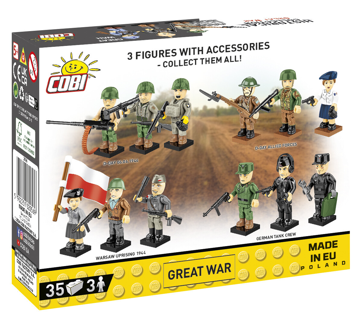 Tato unikátní sada 3 figurek s doplňky z 1. světové války přináší ztělesnění hrdinství a odvahy. Sestava zahrnuje francouzského vojáka vybaveného puškou Lee-Enfield s bajonetem. Německého vojáka, vybaveného puškou Mauser, pickelhaubovou přilbou a vysokými hnědými botami. Sada obsahuje také fragment ostnatého drátu, který byl běžně použit během Velké války. Každá figurka je pečlivě zpracována a je dodávána se základnou, což umožňuje snadné zařazení do jakékoliv sbírky. Stavebnice se skládá z 35 dílků.