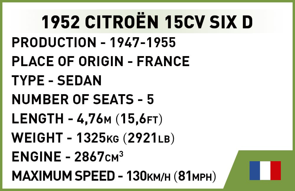 Postavte si model francúzskeho automobilu CITROËN 15CV SIX D prezývaného „Kráľovná ciest“ v mierke 1 : 35. Model disponuje pohyblivými prvkami, ako sú otváracie dvere a veko batožinového priestoru. Súčasťou balenia je jedna figúrka francúzskeho podnikateľa. Zostavený model sa skladá z 262 prvkov a meria 17 cm na dĺžku, 6 cm na šírku a 6 cm na výšku. Kocky COBI sú plne kompatibilné so stavebnicami LEGO.