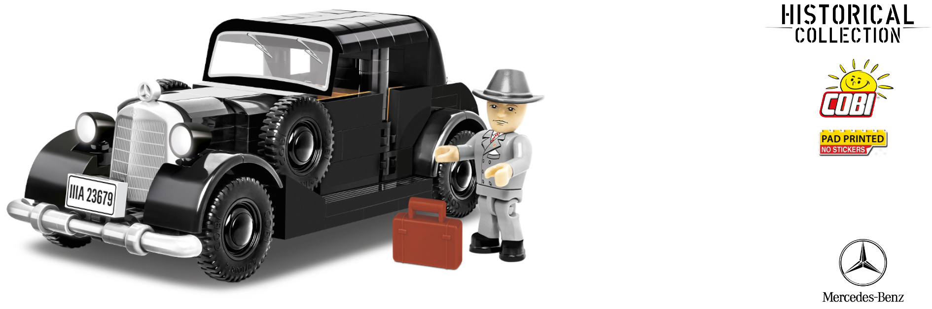 Postavte si model německého automobilu Mercedes 230 (W143) v měřítku 1:35 celkem z 247 dílků. Model má řadu pohyblivých prvků, jako jsou kola podvozku, otevírací dveře a kufr. Vůz překvapí novými typy dílků, které jsou perfektní pro stavbu vozidel a usnadňují další úpravy a navrhování vlastních konstrukcí. Součástí balení je figurka továrníka s kufříkem na dokumenty. Sestavený model měří 15,5 cm na délku a 5,5 cm na výšku.