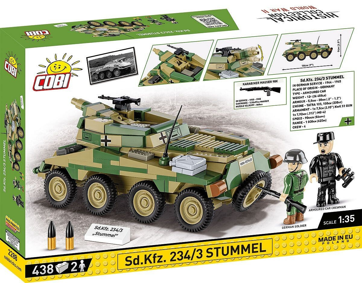 Postavte si model německého obrněného automobilu Sd.Kfz.234/3 STUMMEL v měřítku 1:35. Sestavený model se skládá z 438 prvků. Po sestavení je Stummel dlouhý 18 cm, široký 7,5 cm a vysoký 9 cm. Vozidlo má pohyblivé prvky, jako jsou funkční podvozek a stavitelný náměr kanonu. Sada obsahuje dvě figurky zobrazující člena posádky obrněného vozu a německého pěšáka. Celou sadu doplňuje tabulka s názvem vozidla.