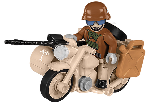 Postavte si model legendárního německého motocyklu z období 2. světové války v barvách Deutsches Afrikakorps! Sestavené vozidlo měří 9 cm na délku a 3 cm na výšku. Model má pohyblivá kola s gumovými pneumatikami, součástí je i kulomet MG 34, rezervní kolo a kanystr. Stavebnice obsahuje 50 kostek, figurku německého vojáka v tropické uniformě s odnímatelnými gumovými brýlemi a jako bonus sběratelskou kartu.