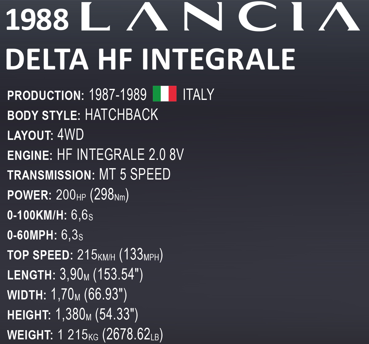 Stavebnice italského modelu Lancia Delta HF Integrale v měřítku 1:12 je skvělou příležitostí ponořit se do bohaté historie rallye sportu. Tento automobil není jen vozem, který dominoval na mistrovství světa v rallye, ale je to také kultovním vozem, který ztělesňuje sílu a rychlost. Model Lancie má pohyblivé části, jako je otáčivý volant ovládající přední nápravu, otevírací kapota motoru, boční dveře a víko zavazadelníku. Stavebnice se skládá z 2068 dílků a po sestavení má rozměry 33 cm na délku, 14 cm na šířku a 12 cm na výšku.
