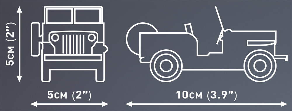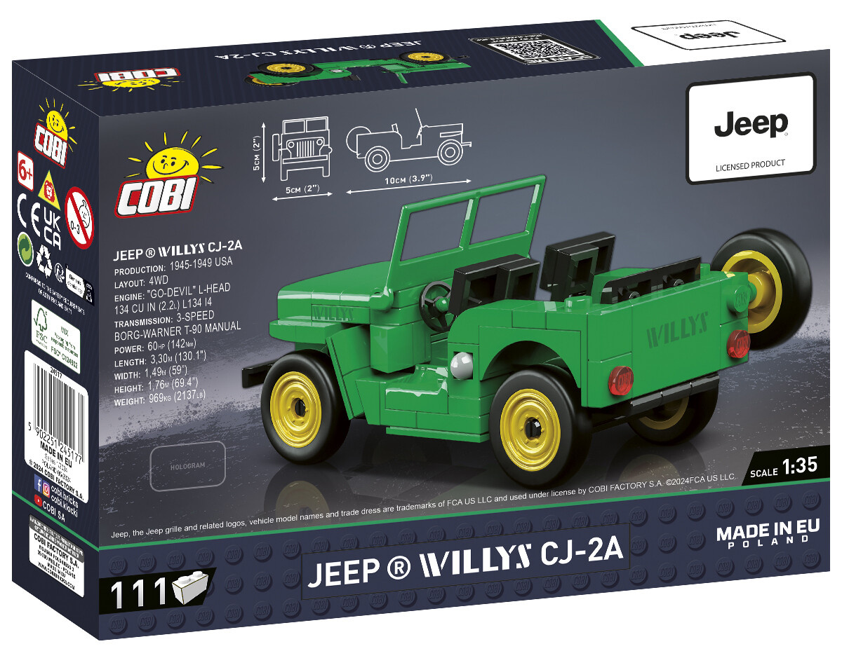 Sestavte si model terénního automobilu Jeep Willys CJ-2A v měřítku 1:35. Stavebnice se skládá ze 111 dílků a sestavený model má rozměry 10 cm na délku, 5 cm na šířku a 5 cm na výšku. Model v klasické zelené barvě je vybaven mřížkou chladiče a sklopným rámem čelního skla. Jeep má otočná kola a je navržen tak, aby se do něj vešly figurky COBI. Stavebnice je vyrobena v oficiální licenci společnosti Jeep.
