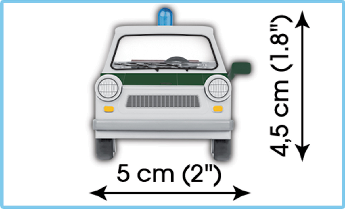 Postavte si model legendárního trabantu ve verzi policejního automobilu z Německé demokratické republiky. Sestavený model má rozměry 10 cm na délku, 4,5 cm na výšku a 5 cm na šířku. Stavebnice obsahuje 82 dílků.