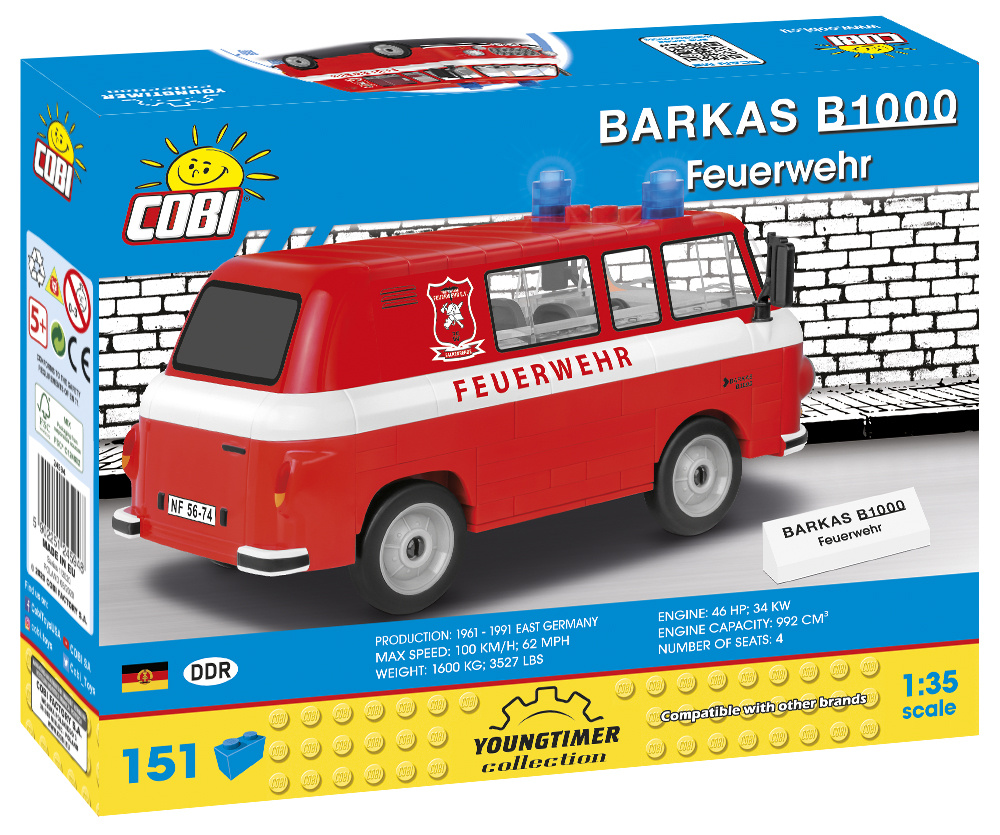 Postavte si legendární model Barkas B1000 ve verzi Feuerwehr, která byla přizpůsobena potřebám hasičů. Model byl věrně reprodukován v měřítku 1:35. Barkas byl vyráběn v letech 1961–1991 v bývalé NDR. Balení obsahuje 151 kostek.