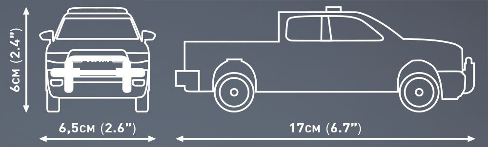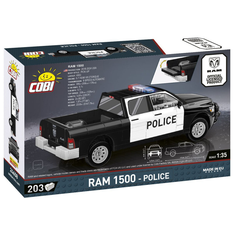 Postavte si model policejního vozu RAM 1500 v měřítku 1:35. Sestavený model se skládá z 203 dílků a měří 17 cm na délku, 6,5 cm na šířku a 6 cm na výšku.