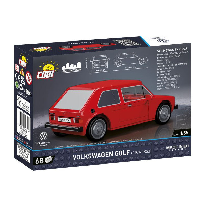Postavte si model vozu Volkswagen Golf (1974-1983), v měřítku 1:35. Model disponuje s otočnými kolečky, která jsou vybavena pneumatikami pro ideální pohyb modelu při hře. Sestavený model se skládá ze 68 dílků a měří 11 cm na délku, 6,5 cm na šířku a 4 cm na výšku.