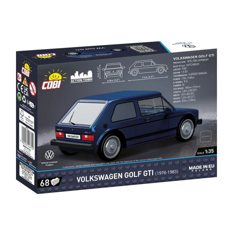 Postavte si model vozu Volkswagen Golf GTI (1976-1983) v modré barvě v měřítku 1:35. Model disponuje s otočnými kolečky, která jsou vybavena pneumatikami pro ideální pohyb modelu při hře. Sestavený model se skládá ze 68 dílků a měří 11 cm na délku, 6,5 cm na šířku a 4 cm na výšku.