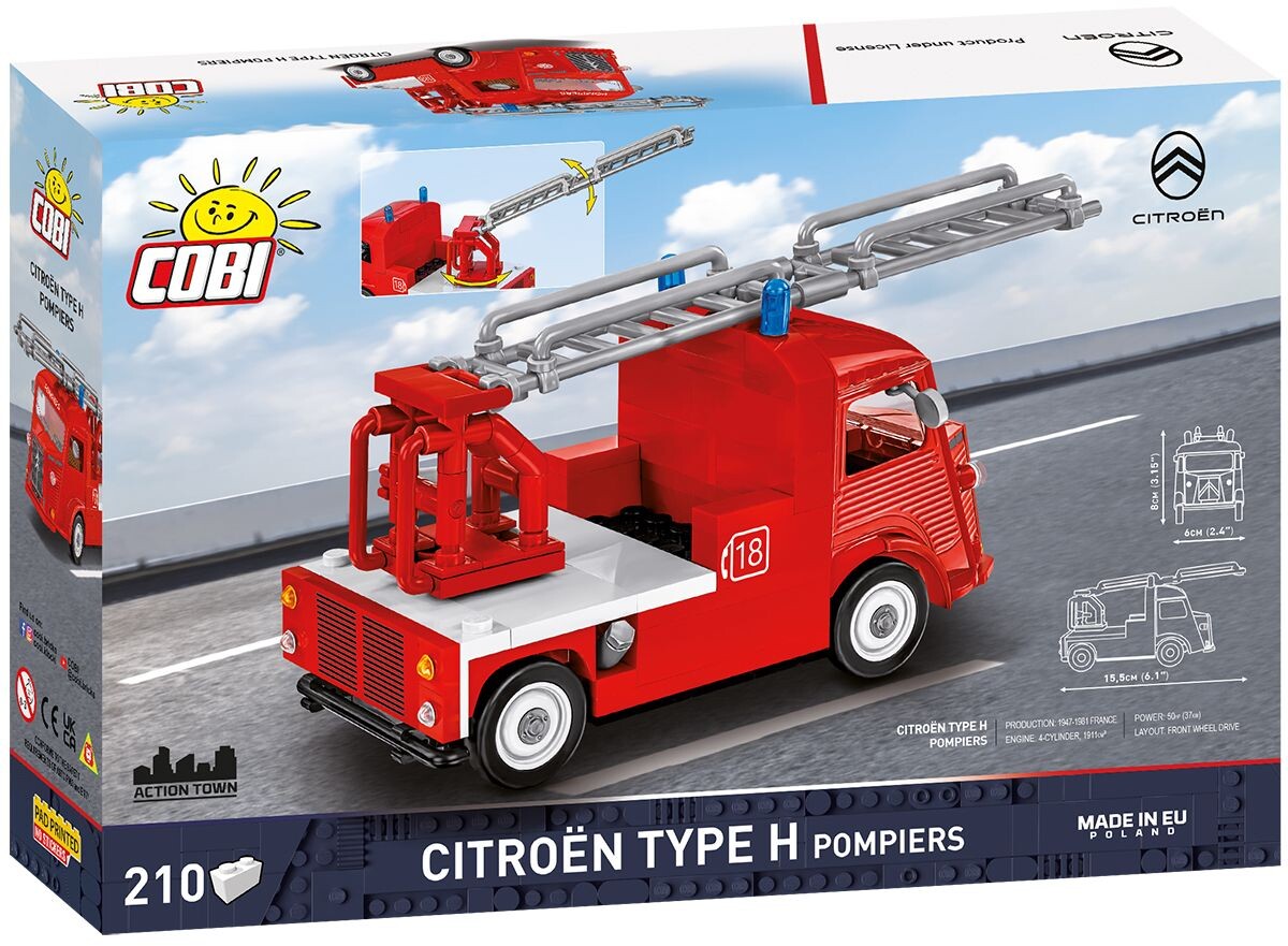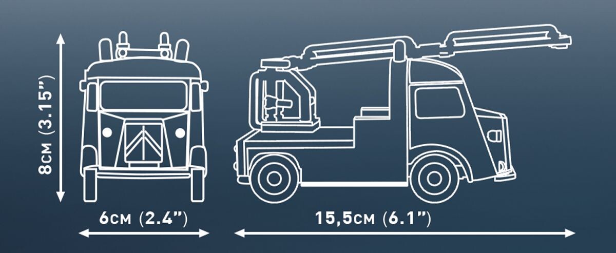 Postavte si Citroën Type H Pompiers, legendární francouzský hasičský vůz v retro provedení, který patřil k ikonám evropských záchranných složek druhé poloviny 20. století. Tento model v měřítku 1 : 35 obsahuje 210 kostek a po sestavení dosahuje rozměrů 15,5 cm na délku, 6 cm na šířku a 8 cm na výšku. Věrně zachycuje typickou vlnitou karoserii, červené hasičské provedení s označením „Pompiers“ i charakteristické detaily dobové výbavy. Model je vybaven otáčivými koly s gumovými pneumatikami a otočným hasičským žebříkem o 360°, což umožňuje realistické vystavení i hru. Veškeré detaily jsou zpracovány pomocí trvalých potisků bez použití samolepek a model vznikl na oficiální licenci Citroën.