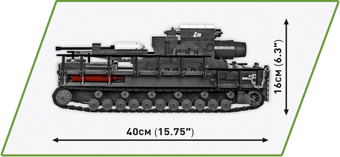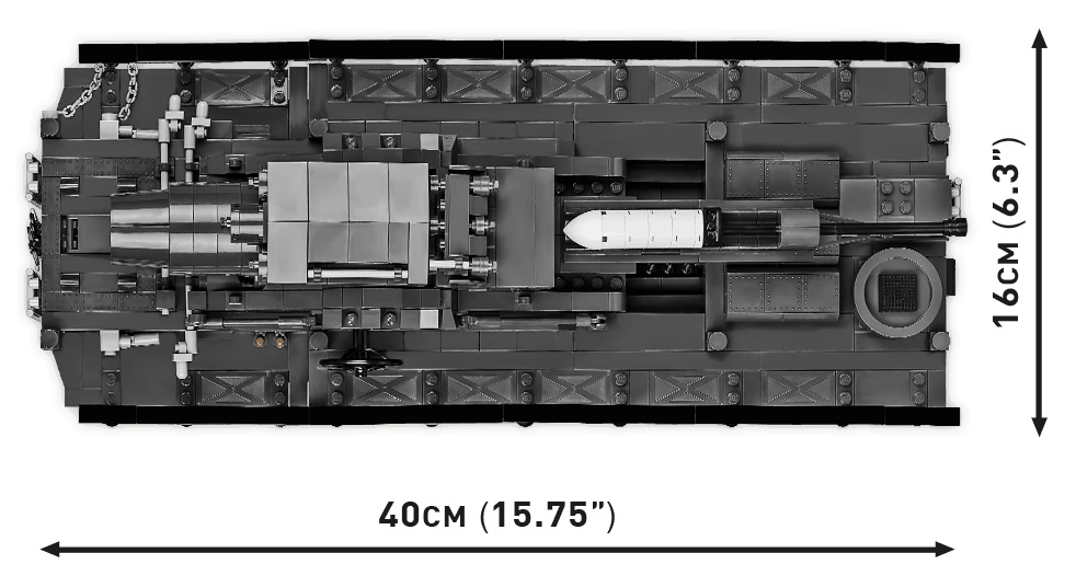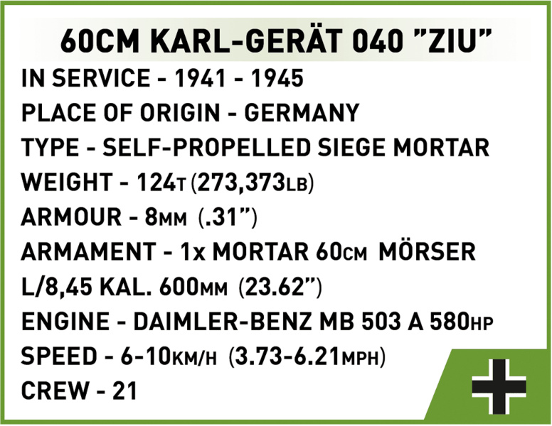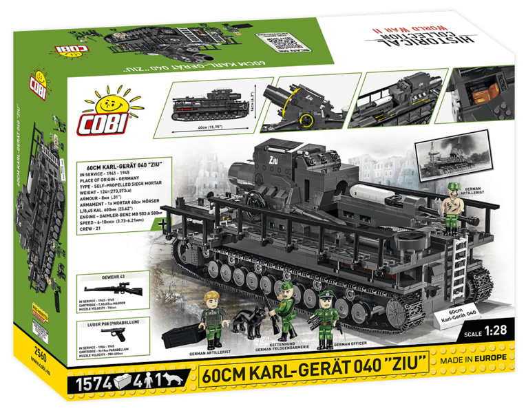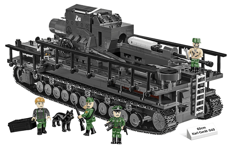 Postavte si model obléhacího německého děla Karl- Gerät 040 v měřítku 1:28. Model disponuje mnoha pohyblivými částmi, jako jsou otočná kola s funkčními pásy, hlaveň a nabíjecí systém. Součástí balení jsou dvě figurky dělostřelců, důstojníka a psovoda i se psem. Sestavený model měří 40 cm na délku, 16 cm na šířku a 16 cm na výšku. Stavebnice se skládá celkem z 1574 dílků a 5 figurek.