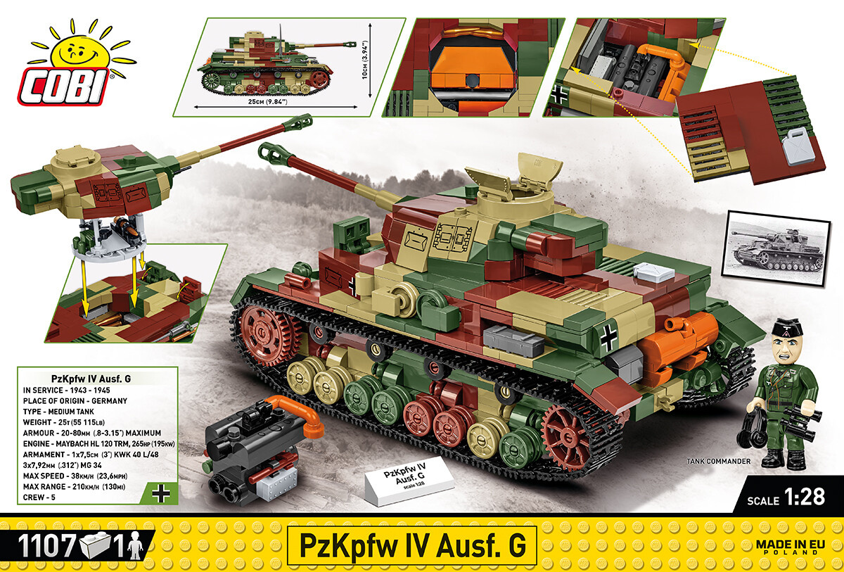 Postavte si model německého tanku Panzer IV Ausf. G, používaného ve 2. světové válce. Sestavený model v měřítku 1:28 měří 25 x 13,5 x 11 cm a má spoustu pohyblivých částí, např. funkční pásy, zvedací poklop, pohyblivé dělo atd. Veškerá grafika je natištěna přímo na kostkách stavebnice stálobarevným tiskem. Balení obsahuje 1107 kostek stavebnice a 1 figurku německého tankisty.