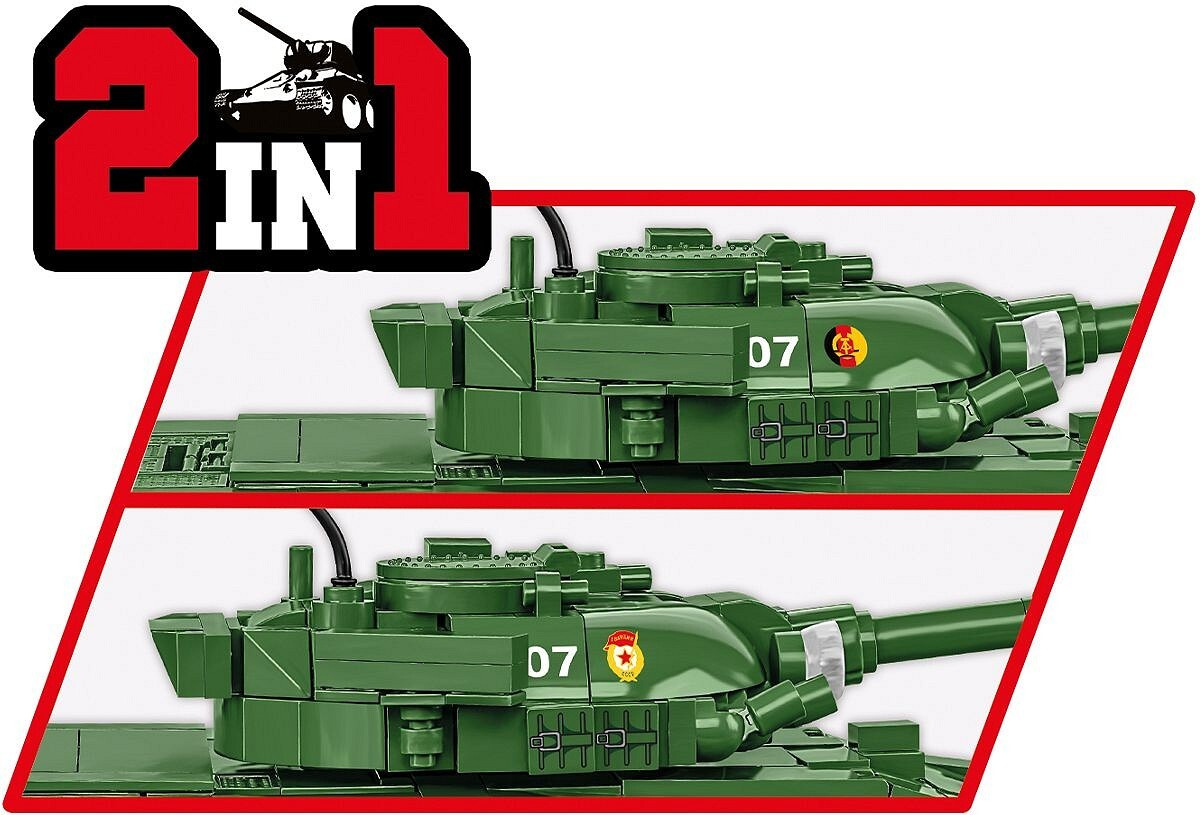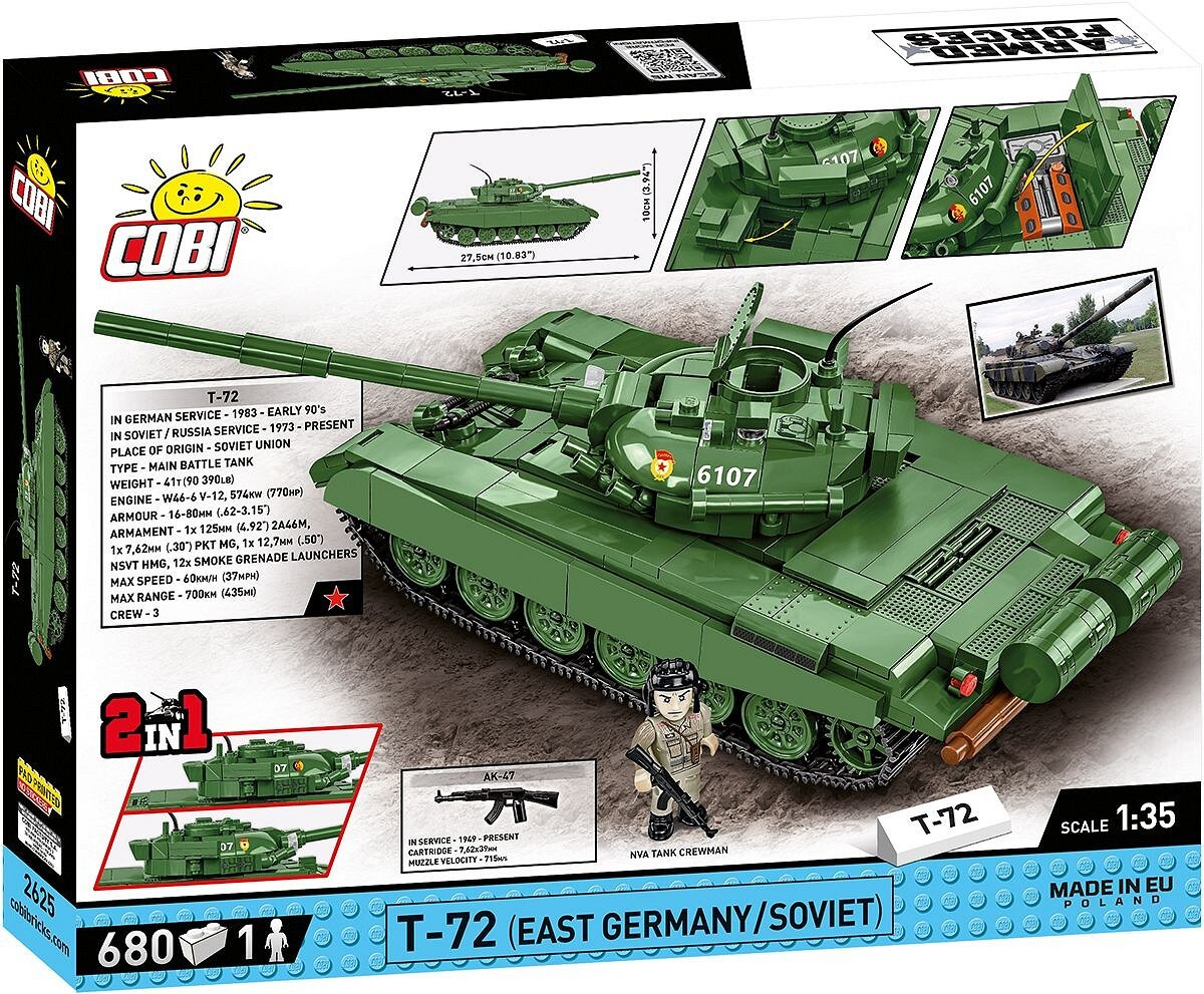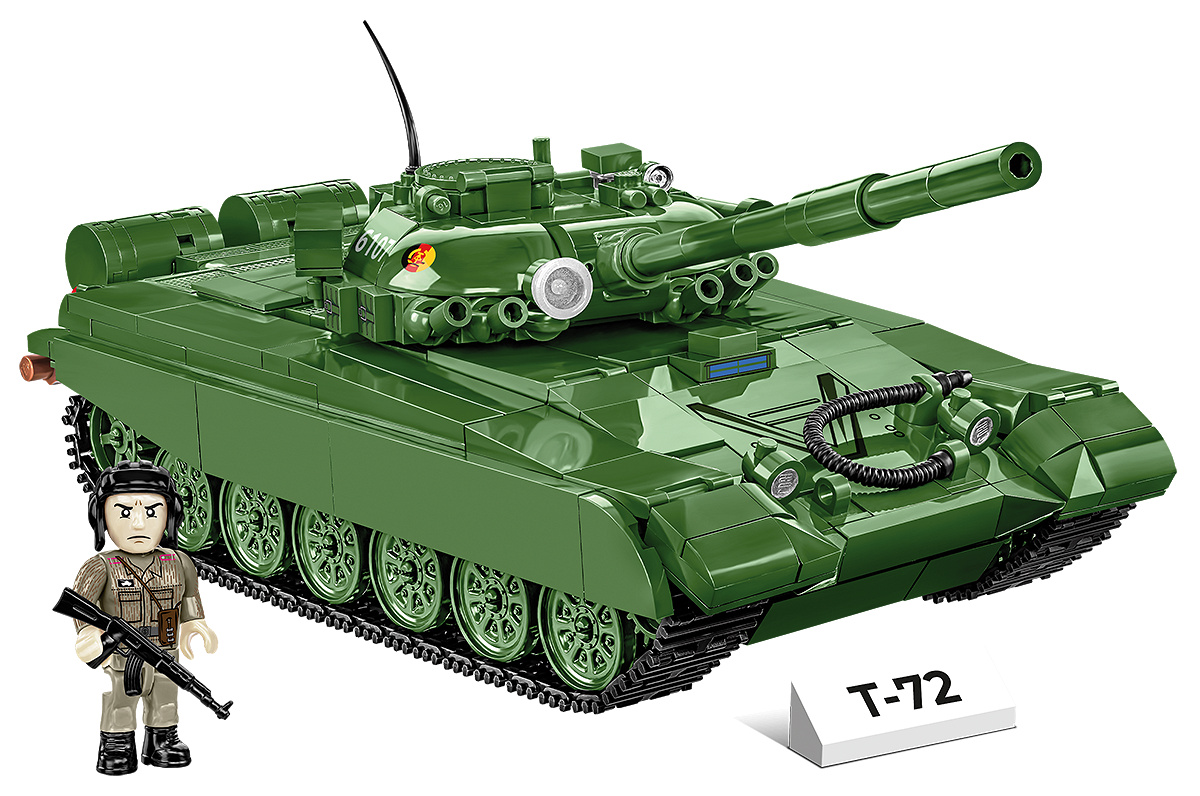 Postavte si model sovětského tanku T 72 v měřítku 1:35 a tmavě zelené kamufláži sovětské nebo východoněmecké armády. Stavebnice obsahuje 680 dílků a 1 figurky tankisty. Sestavený model má rozměry 27,5 cm na délku, 10,5 cm na šířku a 11 cm na výšku. Stavebnice má řadu pohyblivých prvků jako je otočná věž, náměr kanonu, funkční pásová trakce nebo otevíratelné vstupy posádky či kryty motoru.
