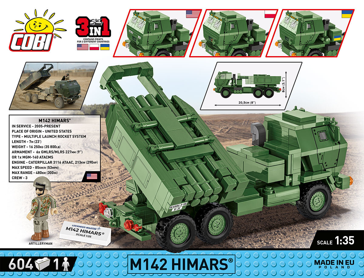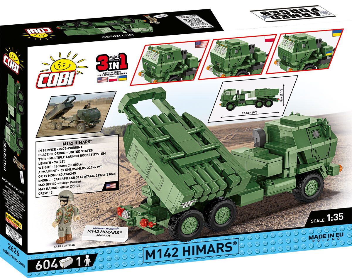 Sestavte si model raketometu HIMARS v měřítku 1:35. Stavebnice obsahuje 604 dílků a figurku dělostřelce a umožňuje sestavení vozidla se znaky USA, Polska nebo Ukrajiny. Vozidlo je po sestavení dlouhé 20,5 cm, široké 7 cm a vysoké 8 cm. Licenční model v měřítku 1:35 doplňuje kolekci současné vojenské techniky a letadel vydávaných pod hlavičkou Armed Forces.