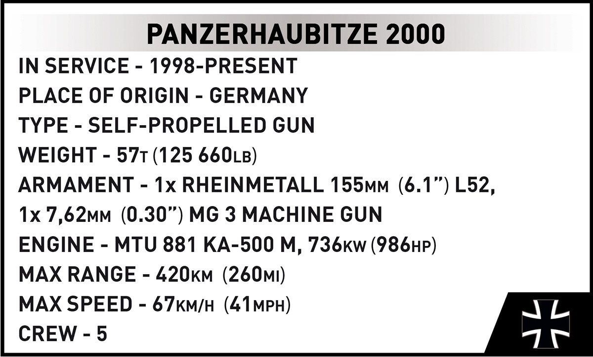 Postavte si model německé samohybné houfnice v měřítku 1:35. Model se skládá z 1006 dílků a po sestavení měří 34,5 cm na délku, 11 cm na šířku a 11 cm na výšku. Sestavený model má řadu pohyblivých částí, jako je otočná věž s pohyblivým náměrem 155mm houfnice nebo funkční pásová trakce. Má také otevírací poklopy a pohyblivý stojan pro stabilizaci obrovské hlavně. V jeho věži je mezitím umístěn palubní kulomet MG3. Model obsahuje všechna označení, včetně konstrukčních detailů, jako jsou registrační značky a větrací otvory.