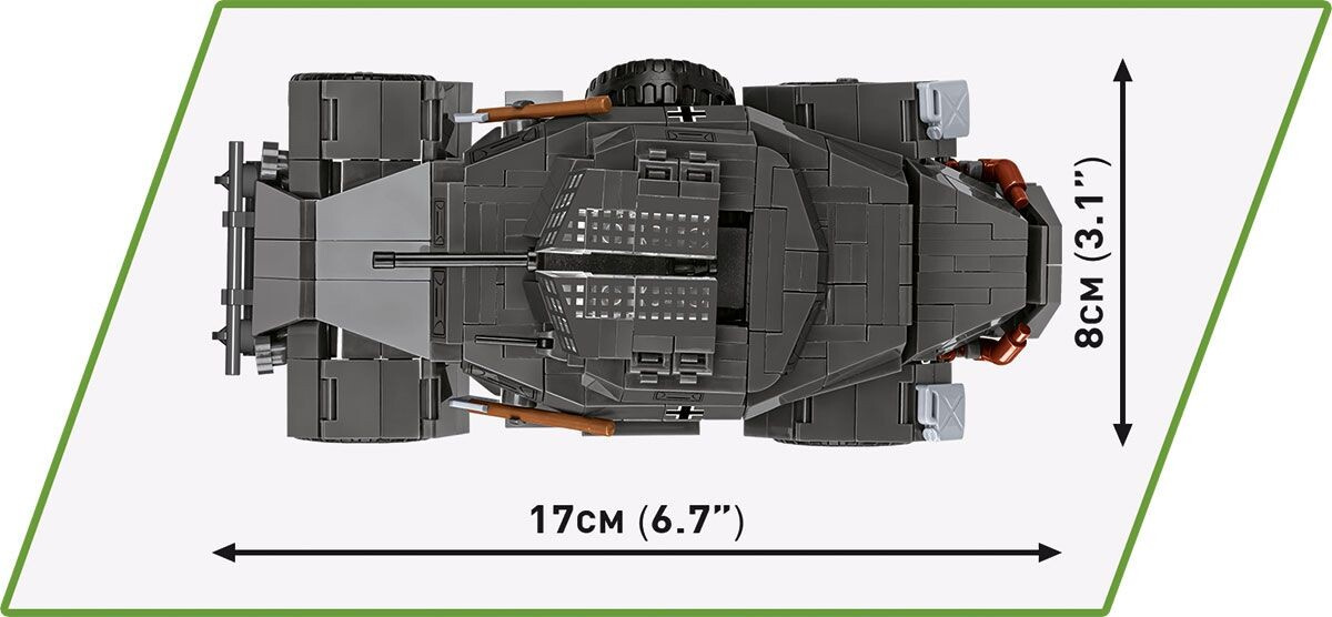Postavte si model Sd.Kfz 222, jeden z nejznámějších německých vozidel z druhé světové války, v měřítku 1:28. Sestavené vozidlo má otočnou střílnu otevřené věže a otevírací ochranný drátěný kryt věže. Na obou stranách vozidla jsou v úchytech lopaty a jeden kanystr. Součástí balení je také figurka německého poručíka s adjutantskou stříbrnou šňůrou a kostka s popisem. Sestavený model se skládá z 502 dílků a měří 17 cm na délku, 8 cm na šířku a 7 cm na výšku.
