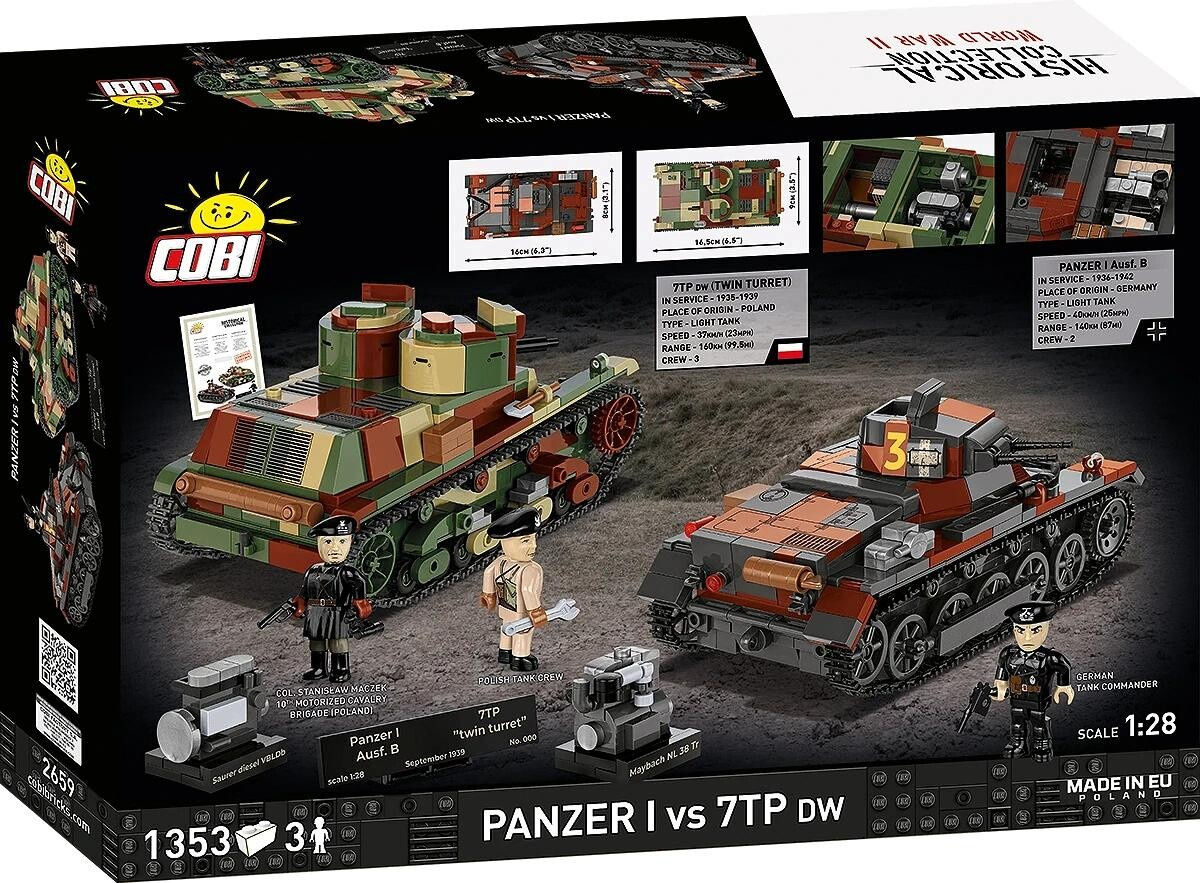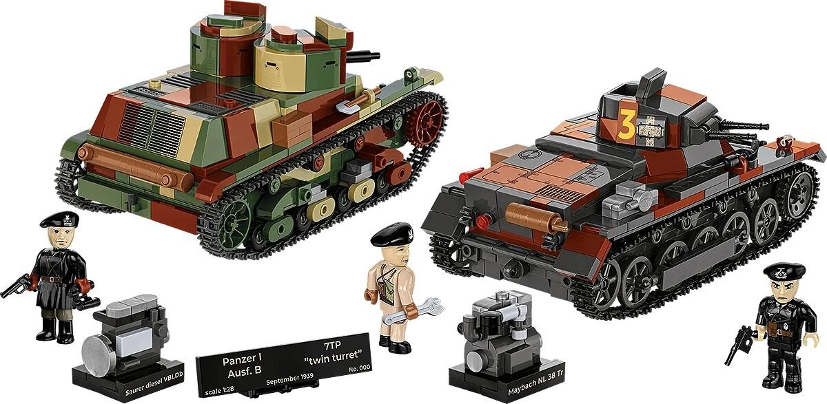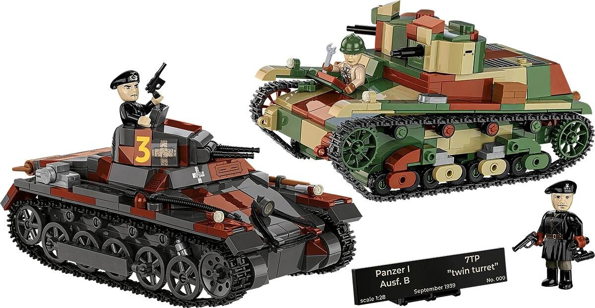 Vraťte se do prvních dnů druhé světové války se speciální stavebnicí COBI, která v jednom balení přináší dva ikonické tanky: německý Panzer I Ausf. B a polský 7TP DW v unikátním dvouvěžovém provedení. Oba modely jsou zpracovány v měřítku 1:35 a vybaveny otočnými věžemi, pohyblivými hlavněmi, otevíracími průlezy a funkčními pásy. Model Panzer I měří po sestavení 16 cm na délku, 8 cm na šířku a 7 cm na výšku, zatímco model 7TP DW dosahuje rozměrů 16,5 cm na délku, 8,5 cm na výšku a 9 cm na šířku. Limitovaná edice zahrnuje tři detailně zpracované figurky – legendárního generála Stanislawa Maczeka v dlouhém kabátě, německého tankistu a polského mechanika – a navíc certifikát originality s výrobním číslem. Sada obsahuje 1353 kostek. Stavebnice je určena pro děti od 8 let a potěší nejen mladé stavitele, ale i zkušené sběratele vojenské historie.