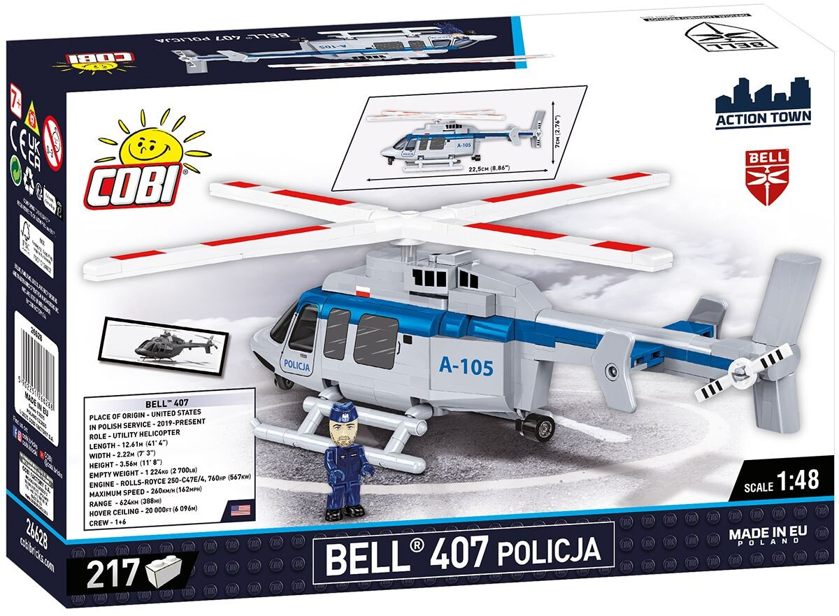 Postavte si model Bell 407 moderní, víceúčelový vrtulník, který byl nedávno součástí vybavení polské policie, v měřítku 1:48. Sestavený model se skládá z 217 dílků a měří 22,5 cm na délku a 7 cm na výšku. Model disponuje mnoha pohyblivými prvky jako je otočná vrtule a další.