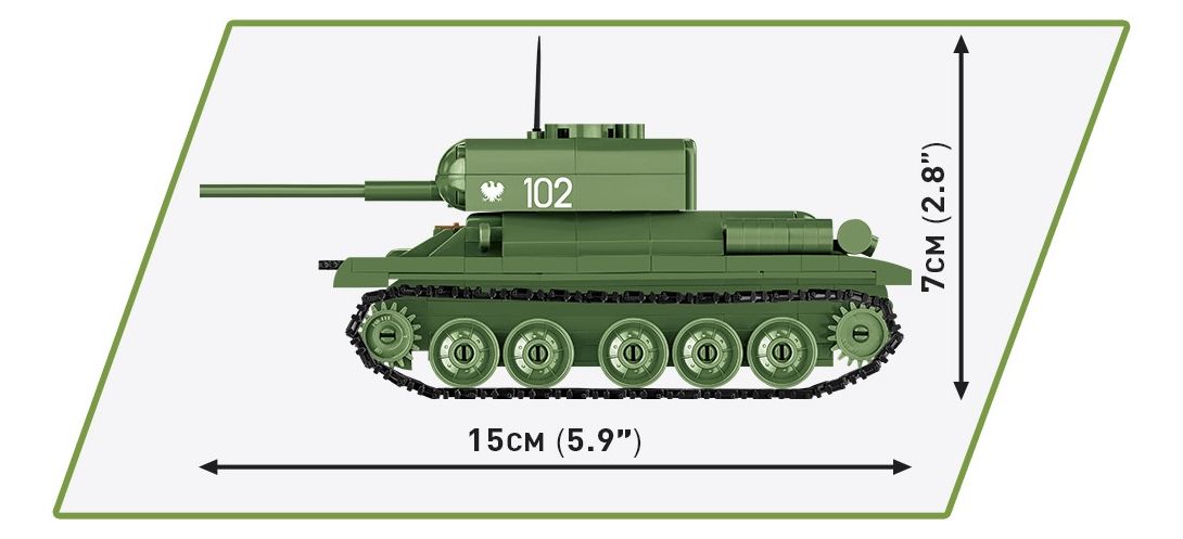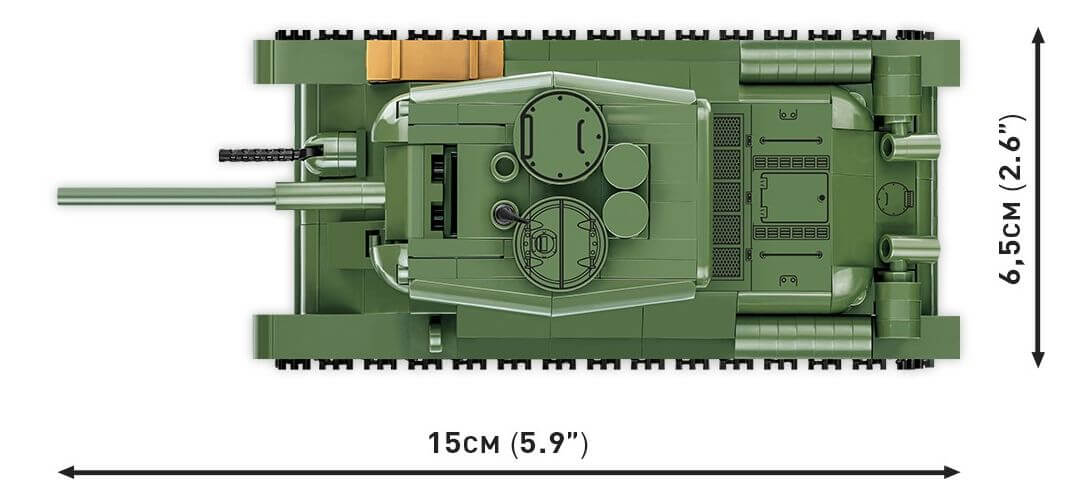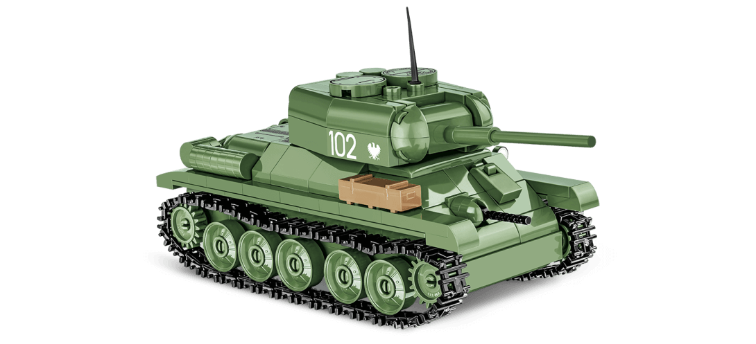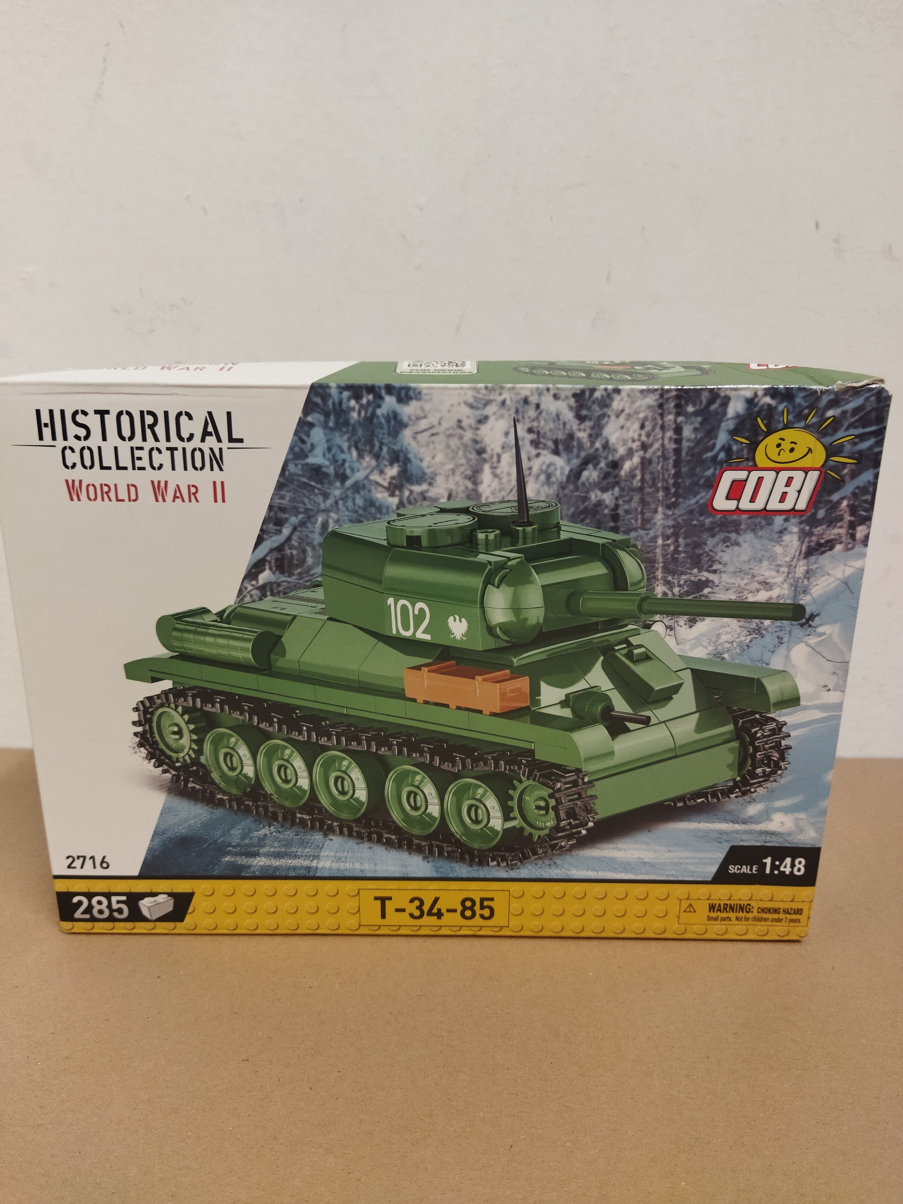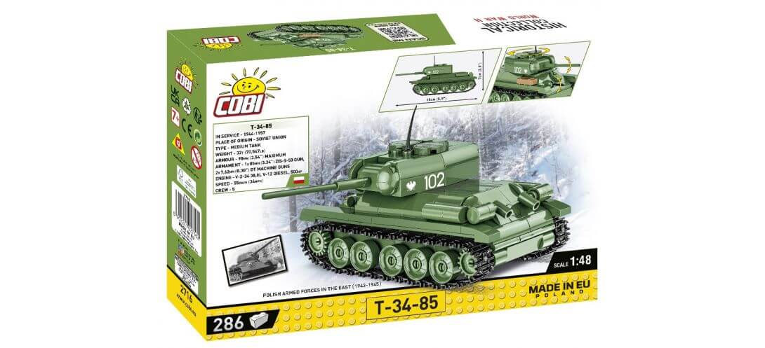 Postavte si model sovietskeho stredného tanku T 34-85 v mierke 1:48. Model disponuje mnohými pohyblivými prvkami, ako sú ako funkčný pásový podvozok, otočná veža a rozmer kanónu. Zostavený model sa skladá z 286 dielikov a meria 15 cm na dĺžku, 6,5 cm na šírku a 7 cm na výšku. Kocky COBI sú plne kompatibilné so stavebnicami LEGO.