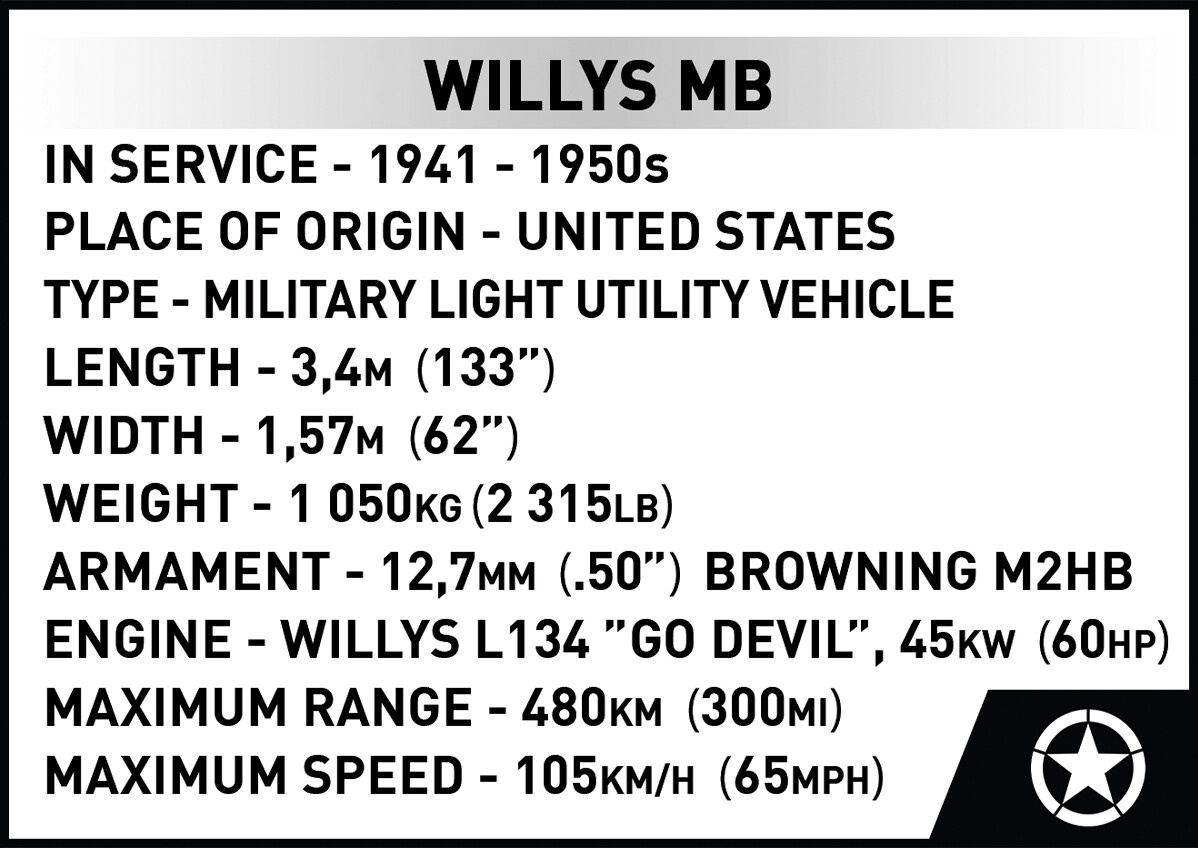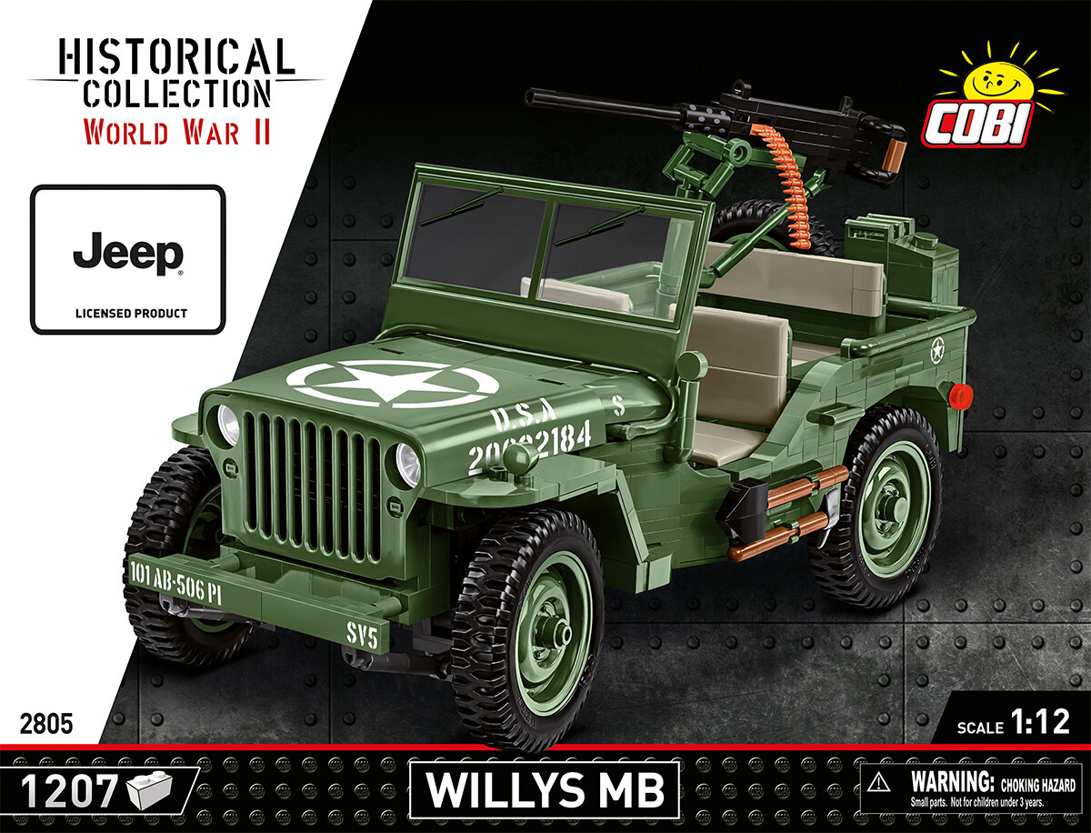 Sestavte si model legendárního terénního automobilu Jeep Willys  ve velkém měřítku 1:12! Model v klasické zelené kamufláži je vybaven kulometem Browning upevněným na otočné lafetě. Má sklopný rám čelního skla, otevírací kapotu motoru a plně funkční podvozek ovládaný pohyblivým volantem. Model sestavený z 1207 dílků má rozměry 27 cm na délku, 14 cm na šířku a 15,5 cm na výšku. Stavebnice je vyrobena v oficiální licenci společnosti Jeep.