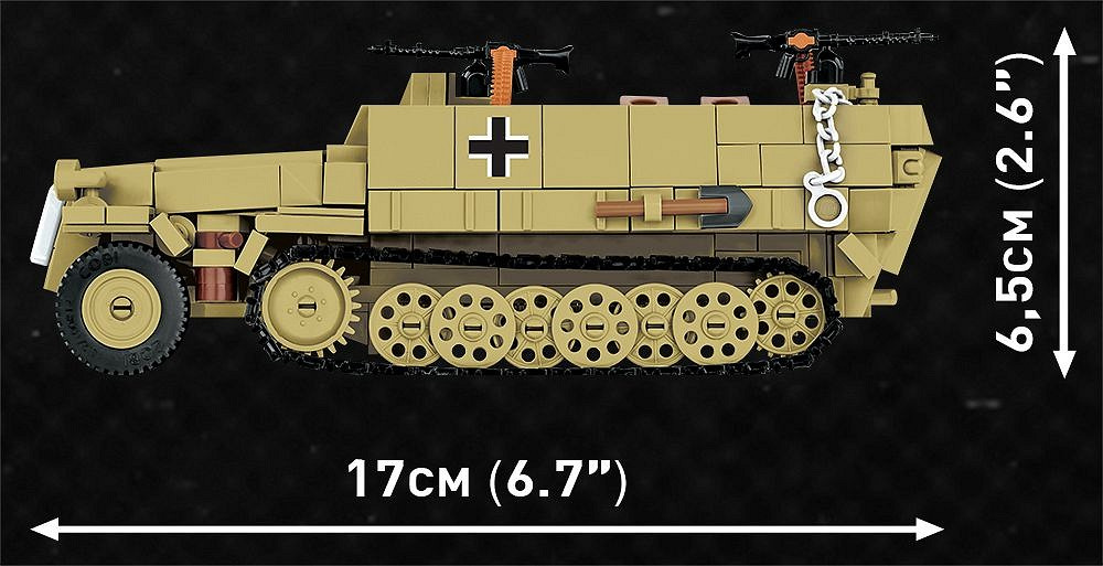 Postavte si model německého polopásového obrněného vozidla Sd.Kfz. 251 Ausf.D v měřítku 1:35. Sestavený model v olivové kamufláži měří 17 cm na délku, 7,2 cm na šířku a 6,5 cm na výšku. Má řadu pohyblivých prvků, jako jsou otevírací zadní pancéřované dveře, přední a zadní závěs s kulometem MG 34 a funkční pásový podvozek. Balení obsahuje 463 dílů a figurku německého vojáka vyzbrojeného samopalem a pancéřovou pěstí. Stavebnice je vyrobena pod oficiální licencí PC hry Company of Heroes 3, společnosti Relic.