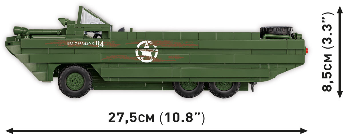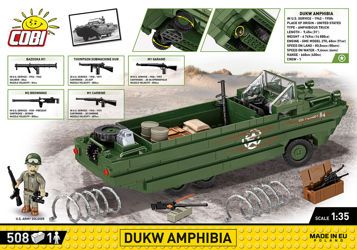 Sestavte si model amerického obojživelného vozidla DUKW Amphibia GMC, které se účastnilo vyloďovacích operací spojenců v Normandii. Model má řadu pohyblivých částí, jako jsou podvozková kola, lodní šroub a naviják na zadní části vozidla. Součástí balení jsou barely a kanystry na palivo, rezervní kolo, pytle s pískem, muniční bedna, žiletkové dráty a figurka amerického vojáka vybaveného dalekohledem a celou řadou zbraní. Sestavené vozidlo v měřítku 1:35 má rozměry 27,5 cm na délku, 7,5 cm na šířku a je vysoké 8,5 cm. Stavebnice je vydána u příležitosti 80. výročí vylodění spojenců v Normandii.