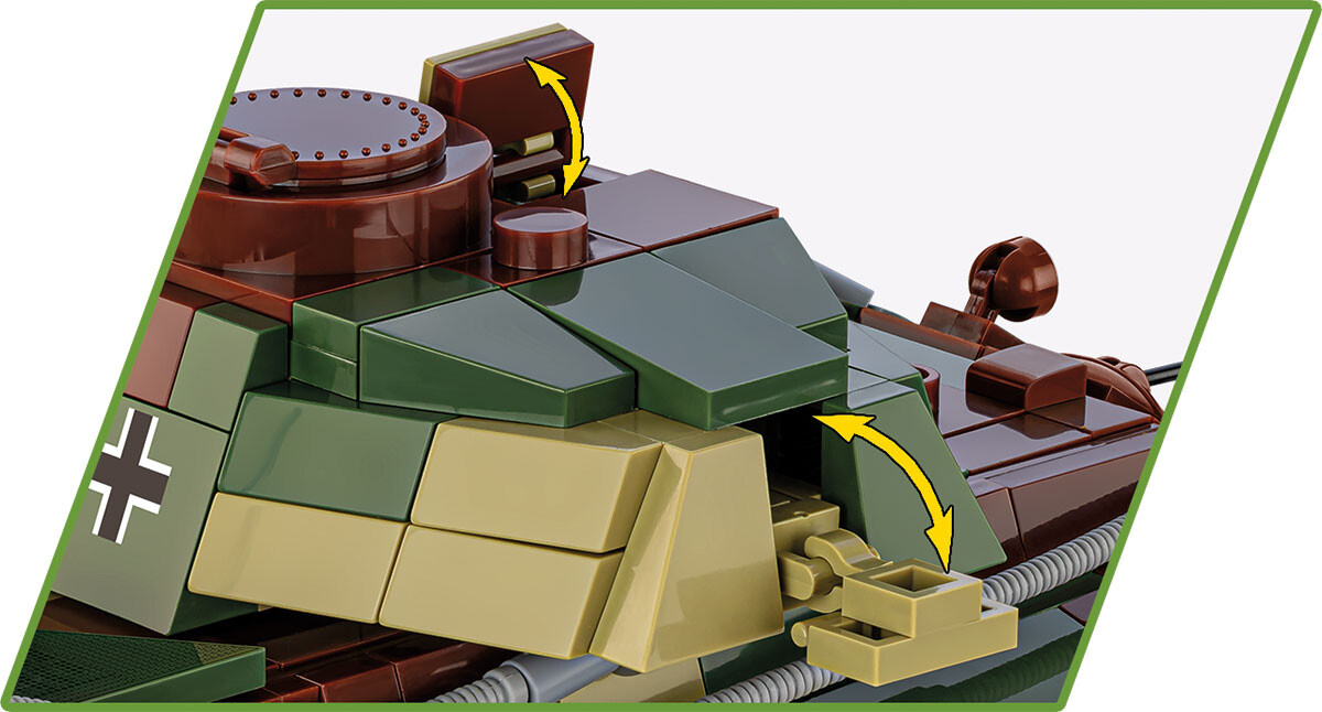 Postavte si model německého tanku „Konigstiger" z 2. světové války v měřítku 1:35. Stavebnice obsahuje 802 dílků a figurku tankisty. Sestavený model má rozměry 30 cm na délku, 11,5 cm na šířku a 10,5 cm na výšku. Tank má otočnou věž s nastavitelným náměrem kanónu, otevírací poklopy průlezů a kryt motoru poskytují přístup k motoru. Unikátní motor je vyjímatelný, což umožňuje jeho samostatné vystavení. Funkční pásy navíc zajišťují, že s modelem lze snadno pojíždět po neklouzavém povrchu.
